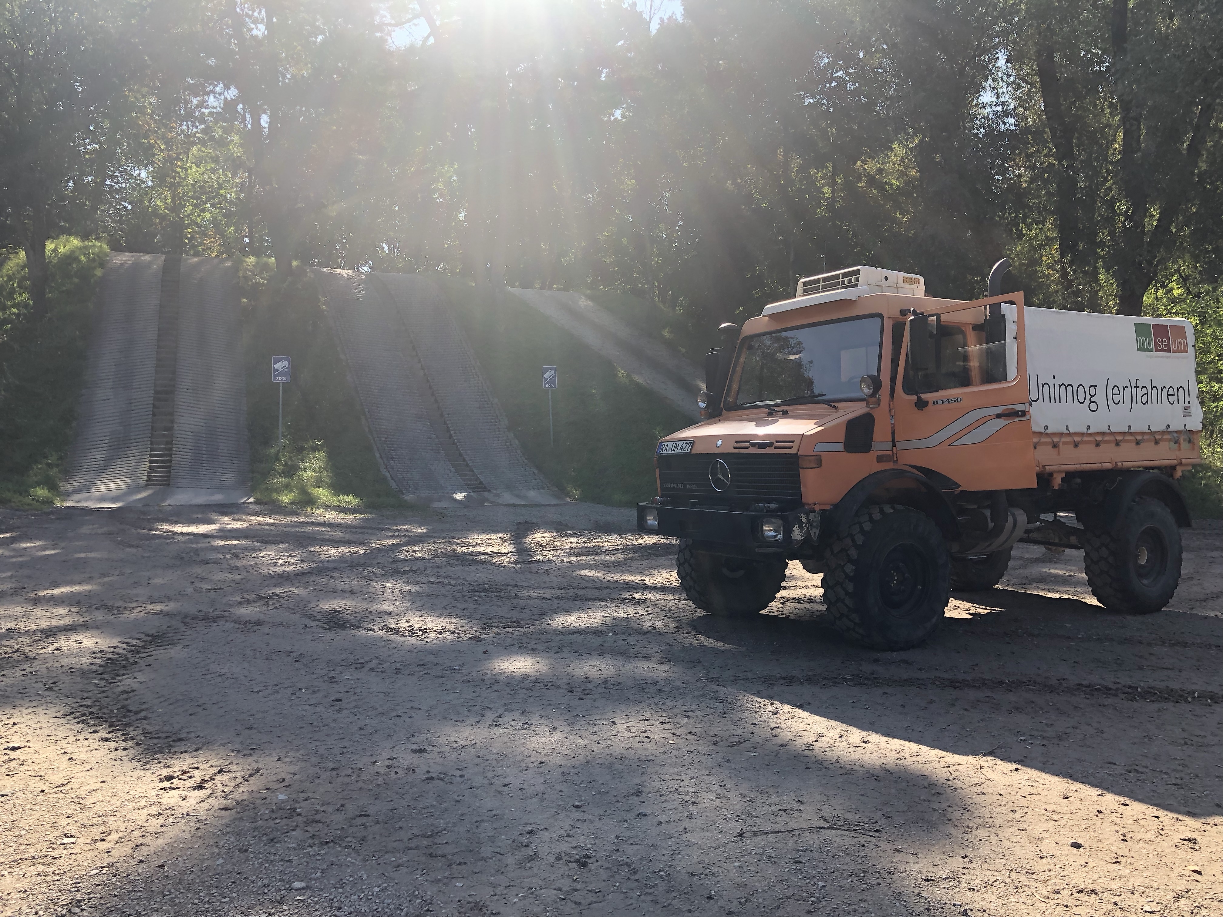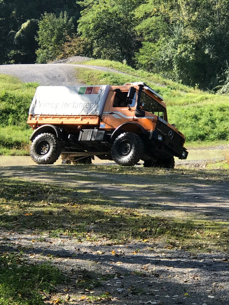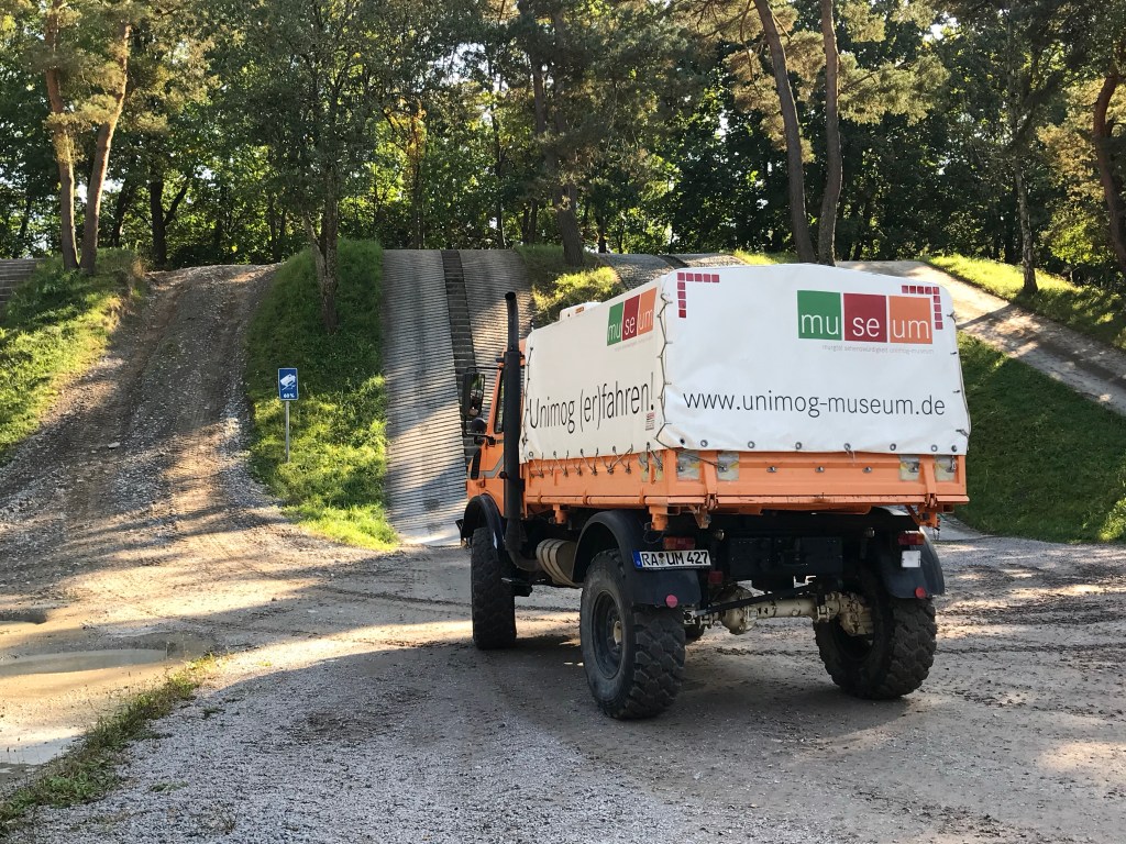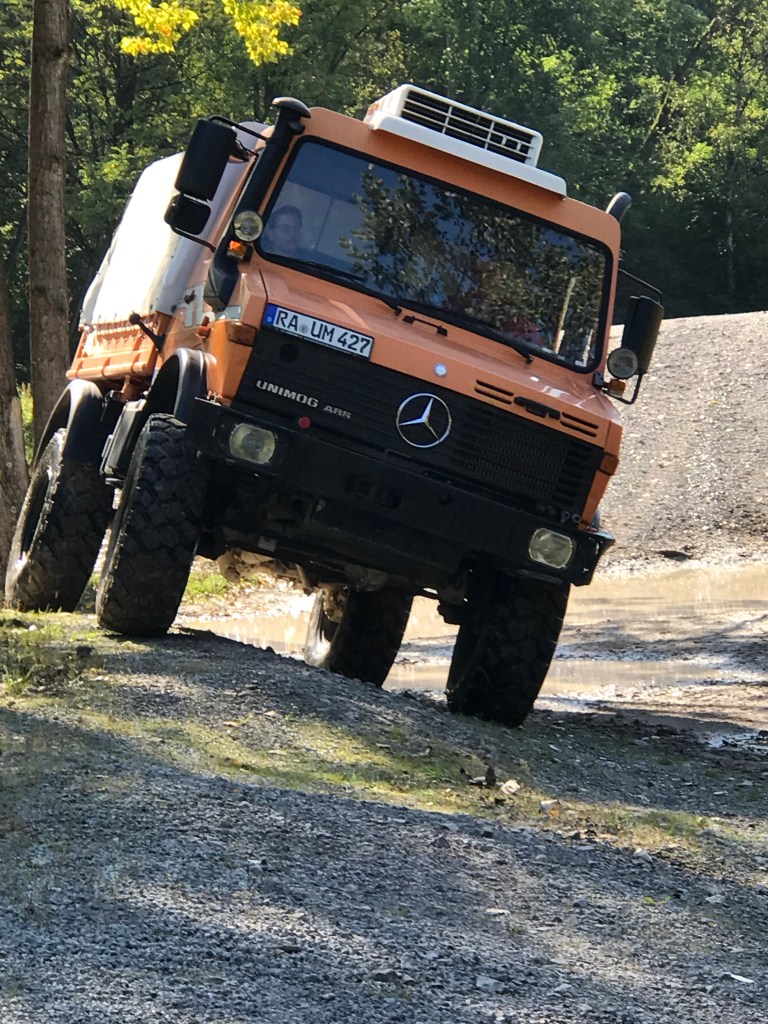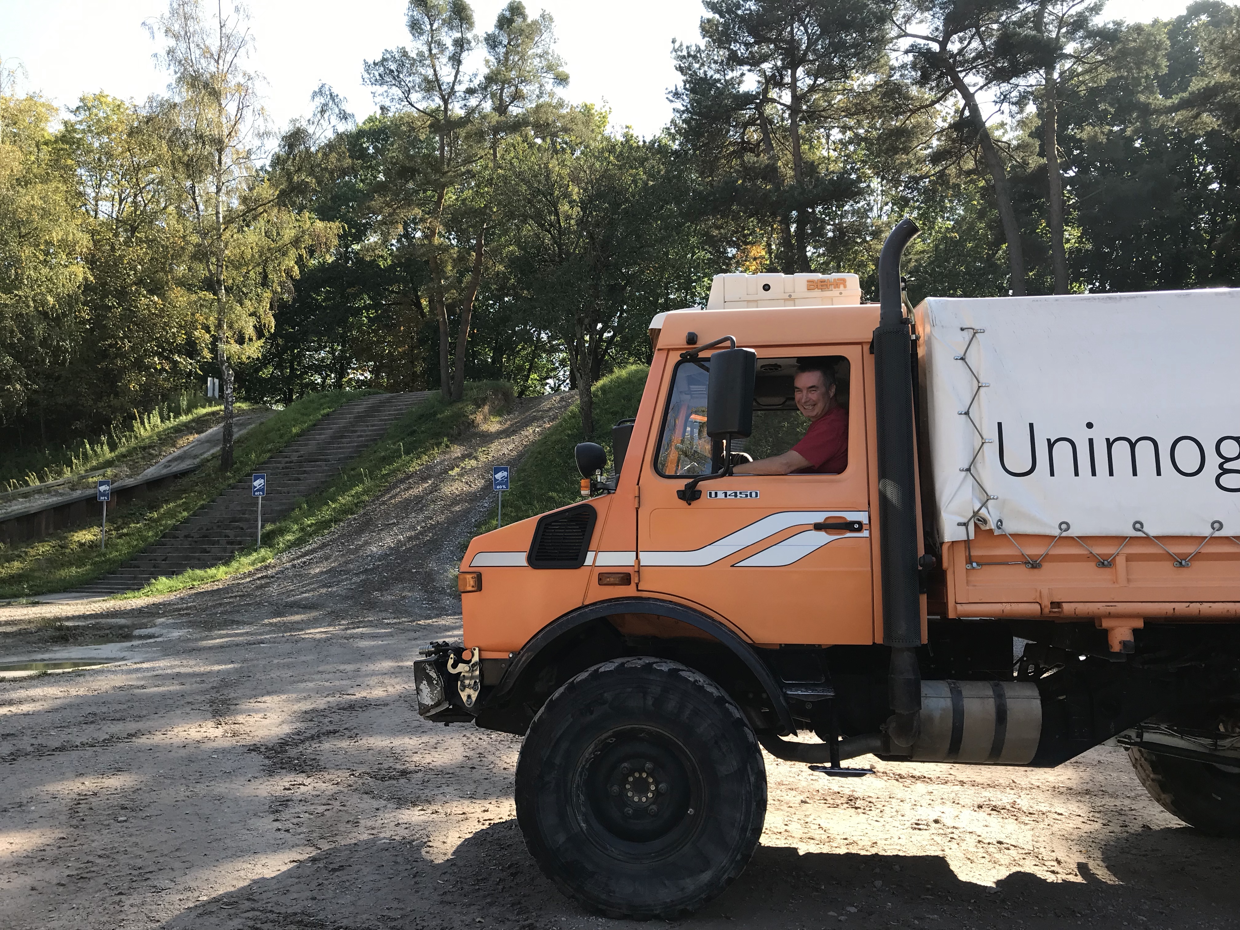 Next was a tour of the small shop at the museum for some momento, we need to have some t-shirts to wear when we visit the Abenteuer Allrad (Adventure Overland) show in Bad Kissingen on 21st-24th Oct. we then met up with Roland again ready to start the Intensive Off-Road Driver Training in the Unimog, for which yesterday’s course was a pre-requisite. Today’s course is in Ötigheim, the official Mercedes Unimog proving ground, where military customers etc are brought to show their capabilities. It is certainly impressive, the 100% hill ascents are more of a climb than a walk uphill.