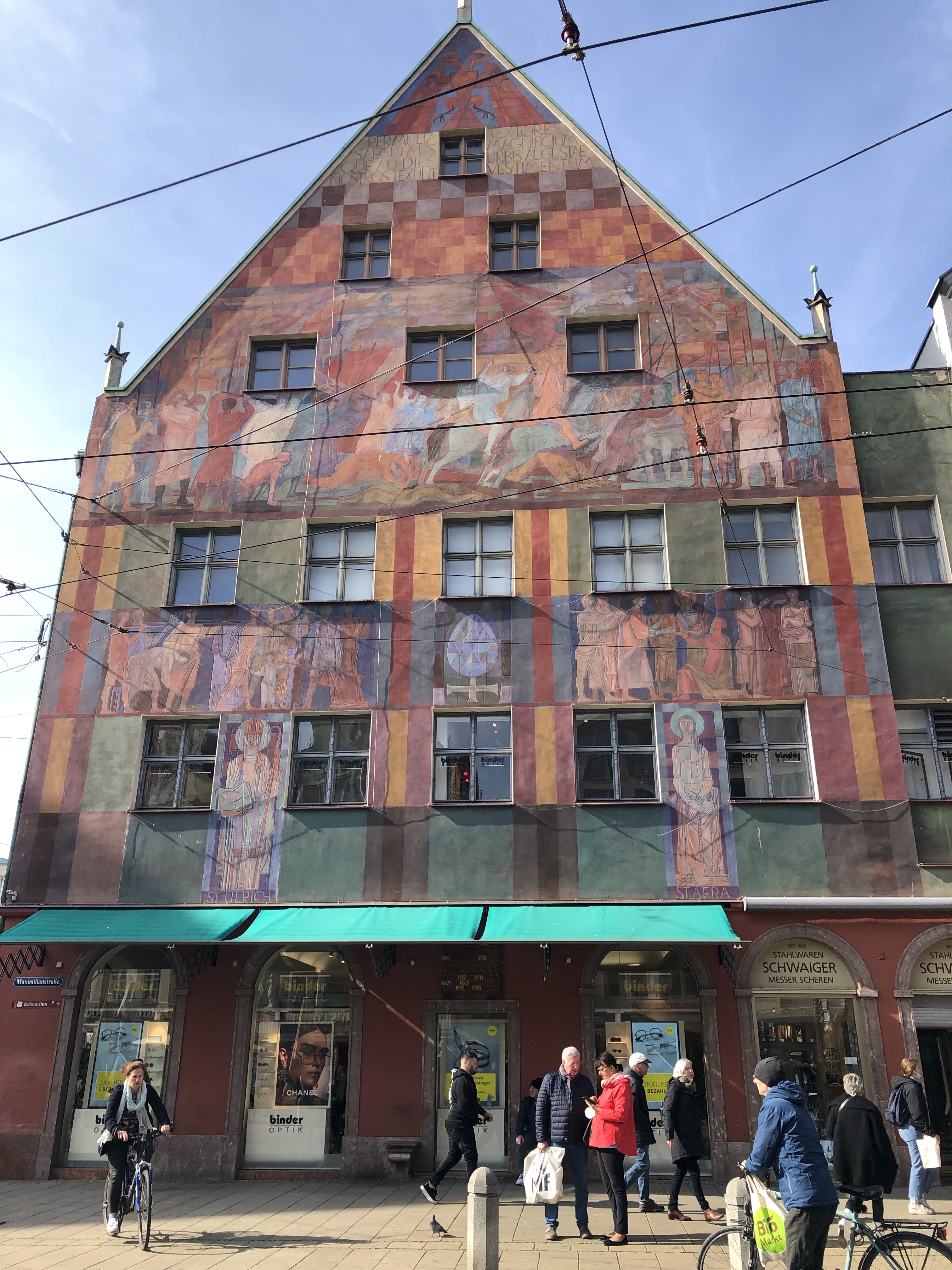 We managed to have lunch outdoors in the sun, albeit in coats 😎. We were outside Fugger’s city palace, one of two rich bank families which ran Augsburg for many generations (think Medici). They also created the oldest social housing estate in the world in 1523, which allows people to live in the 52 houses there for one Rhenish guilder per year, a rate maintained to this day for residents (0.88€) also requiring them to make three daily prayers per day, be catholic and become indigent, but without debt. It is also a tourist attraction now, but it seemed wrong to go sightseeing where people are living due to need.