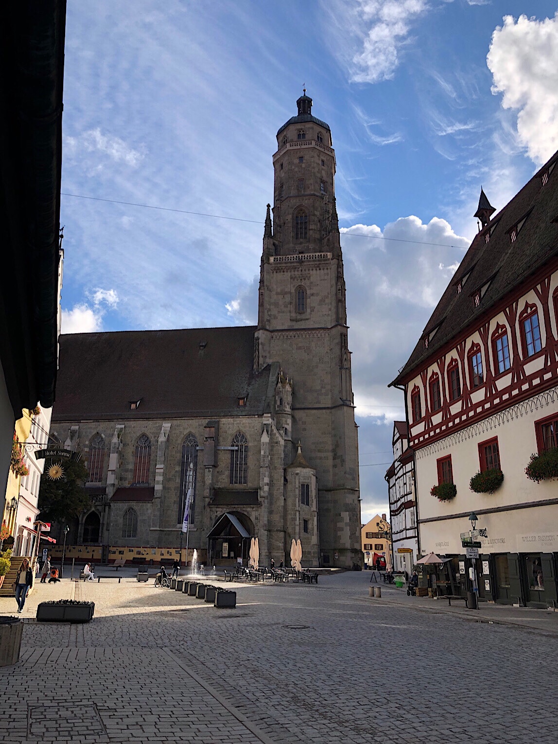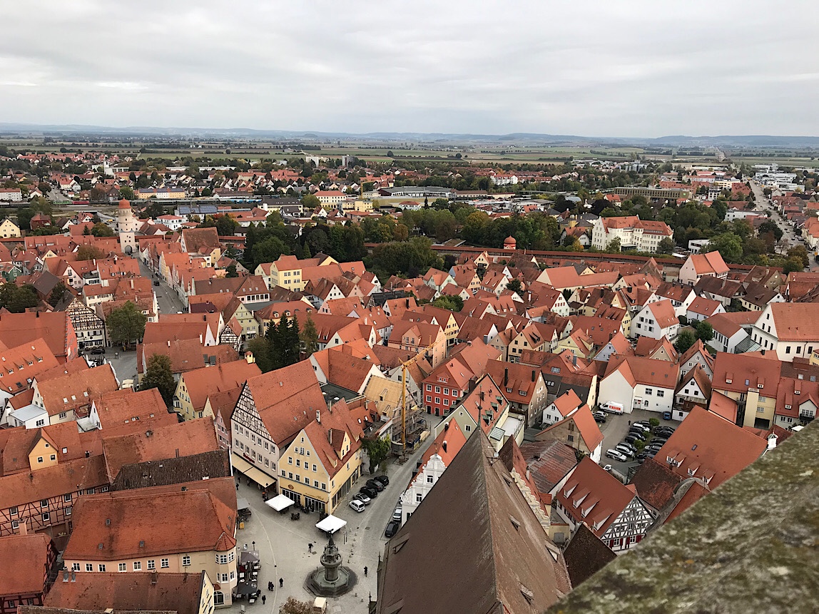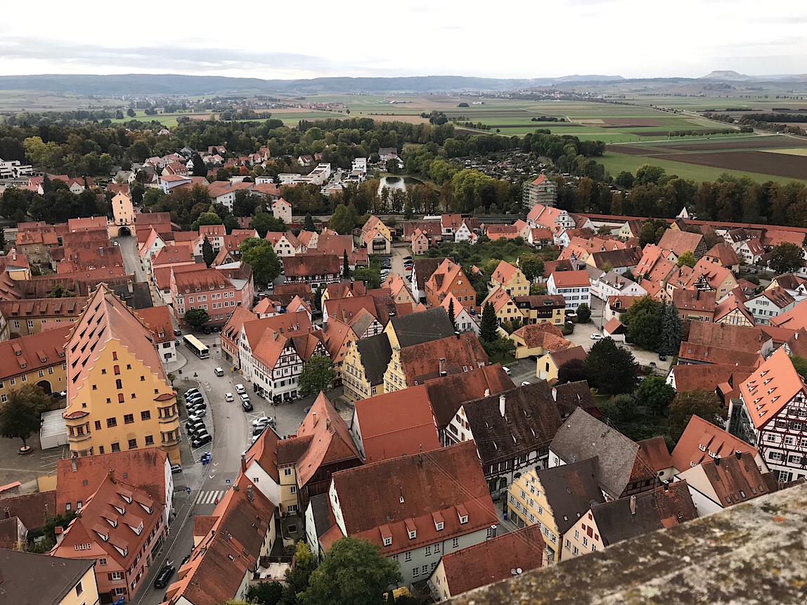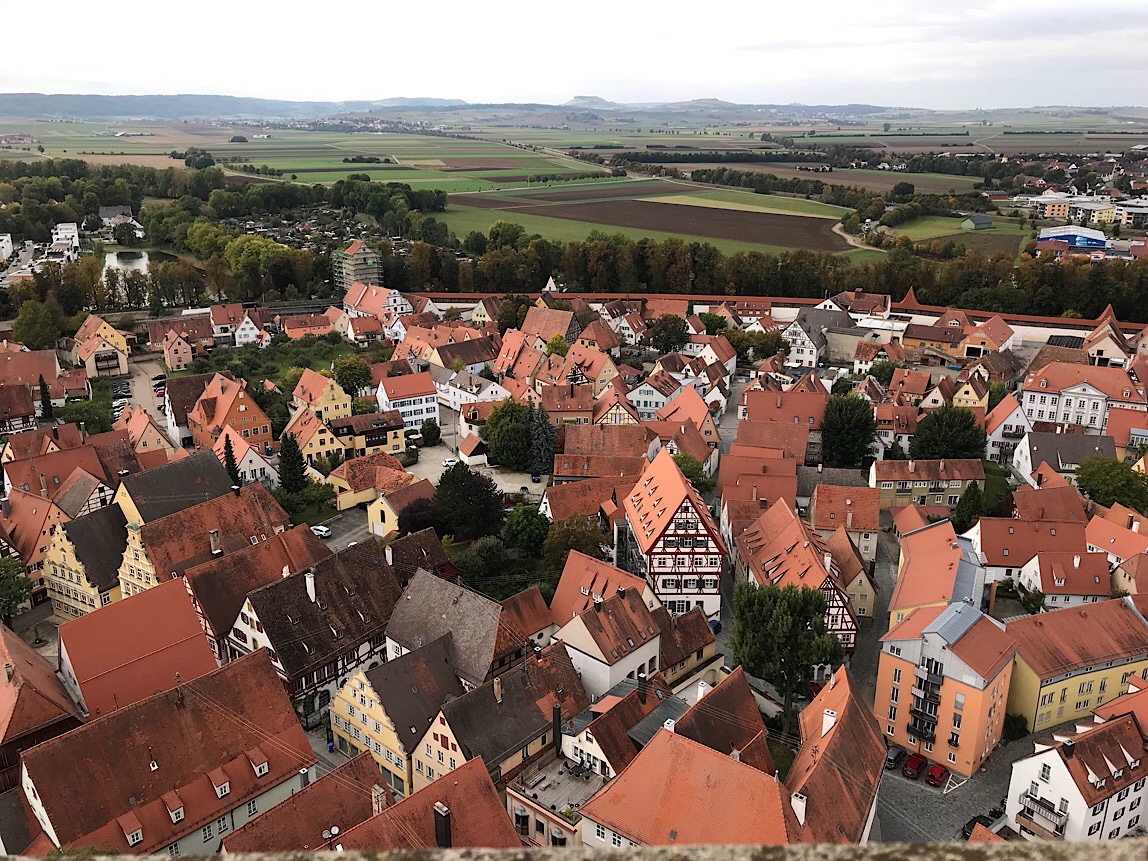 The main target today was to ascend the Daniel Tower of the St. Georg church. It sits in the centre of the Nördlingen crater and the time radiates around it. I was told it gives a good view of the crater and the countryside beyond, but it seemed to be closed yesterday. So up the 350 steps to the top of the 90m tower I go. Leniently, the pay desk is at the top of the tower and you only pay when you have reached the top and want to go and enjoy the view. This did mean the elder gentleman behind the counter climbed the steps twice a day as he informed me proudly when I mentioned it was quite a hike. Though to be fair it would not have been so bad without having to wear a mask. I can understand a little the issues of those with breathing issues
