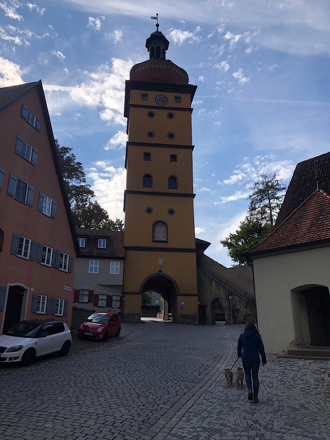 The Stellplatz we chose at Dinkelsbühl near the Rothenburger Tor entrance to the town (found via SearchforSites App). There are I think three Stellplatz in town, we chose this it is an easy route in, big pitches and near to town. There is also a nice bit of field alongside a stream to walk the dogs. We arrived just before lunch and the sun was blazing and easily got a nice big pitch, turns out that was good timing as by evening there were 30-40 vans parked up wherever they could get including someone cheekily parking across the gap between us and the next pitch. It must be a proper scrum in the summer for places.