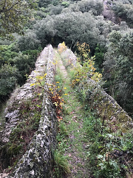 We headed off for the 20 minute walk from our Aire to the aqueduct to reach several barred gates and barriers to the visitor centre demanding a 9€ entrance fee and which was closed anyway. We wondered through the car park but only got a distant view through fences and trees, our route was blocked. However, we had come a long way to see this and we were not to be deterred so easily so headed back into the woods to walk to a viewing point on the top of the gorge. We followed the marked path quite a way before Kev checked the google maps, only to find we were off track. It was obviously the locked gated entrance we had passed. However we saw another smaller route that headed in roughy the right direction and decided to try that. However after clambering up a steep rock path we found we had in fact discovered the Sartanette Cave, which is believed to have Neolithic origins, many different animal bones having been found within. The entrance now is fenced off, according to the signs it being home to bats, apt for Halloween however it also brought to mind the recent linking of coronavirus to bats, we pushed on up the hill. Only after several attempts to follow animal tracks to a dead end and realising there was another gorge between us and the viewpoint we headed back the way we had come.