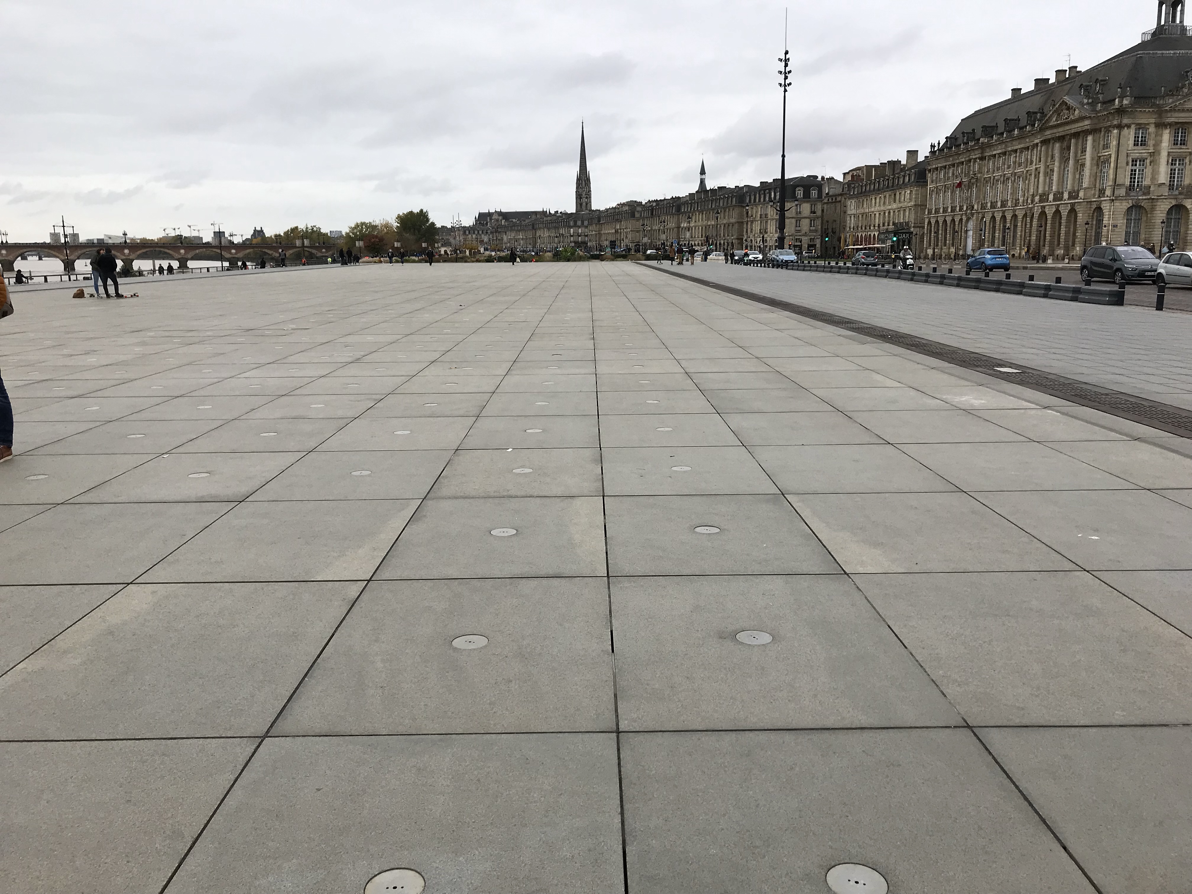 The monument overlooks a huge square which is often used for events and had clearly had what appeared to have been a market / antiques fair the day before. All that remained today was people packing away sadly. So we carried on to the Gironde river, another enormous European river / estuary. Except perhaps the Severn, we really don’t have anything of the scale of the rivers we see here. There was quite pretty (and long) bridge (the Pont de Pierre) across. We headed to one of the sightseeing highlights the Miroir d’Eau opposite the Palais de la Bourse. A 3450 sqm square of block granite which forms a pool and in sunny days provides a reflective pool. It is refilled every 30 minutes….apparently, as we we got there it was dry. Obviously it is a summer only attraction.