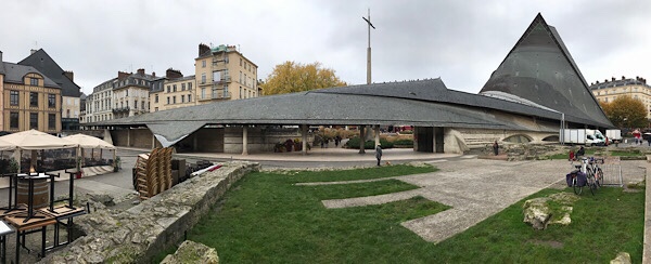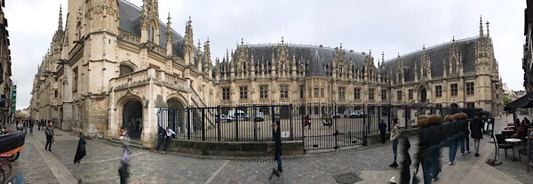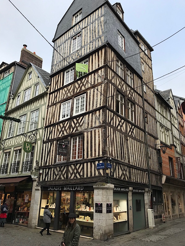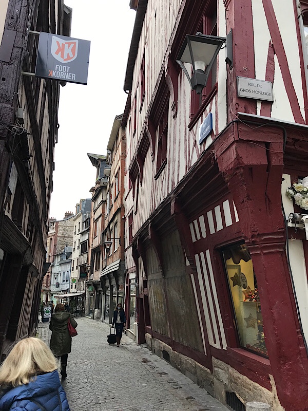 We soon arrive at Rue Jeanne d’Arc and head up into the old quarter. Due to admin jobs etc it is heading to lunch by the time we arrive and we head towards the Place du Vieux Marché (Old Market). The square is at the end of the old main thoroughfare the Rue de Gros Horlage (Street if the big clock) was where Joan of Arc was burned at the stake for heresy in 1431. Today it has a very modern looking Église Jeanne d’Arc church (1979) with undulating fish scale roof and traditional market with fruit, vegetables, cheeses, meats etc. The Rue de Gros Horlage and many of the side roads off it is really well preserved with tall timber fronted Tudor era houses leaning in across the road ahead. We marvel at the twisted wood and age-bent timbers still maintaining the structures 500 years + since they were built.