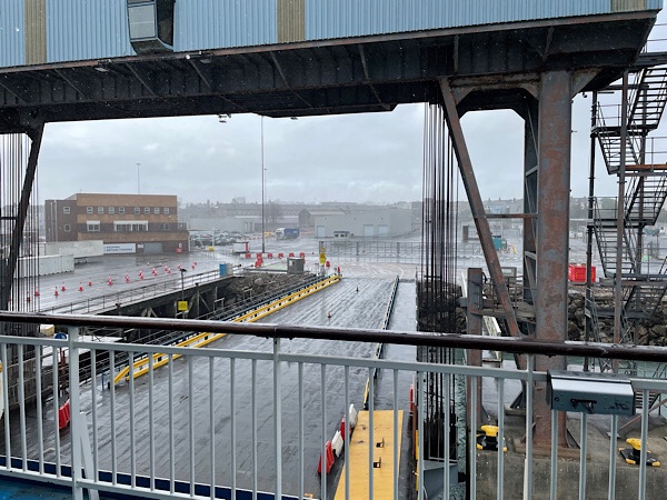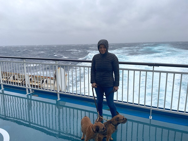 We got ourselves settled in with a celebratory beer and the dogs with some food and a first trip on the dog walk deck to try and persuade them to break the habits of a lifetime to do their business on a hard metal deck. Lola the bold was persuaded but Lizzy the sensitive was not to be persuaded for the whole 24 hour crossing despite many trips out.
