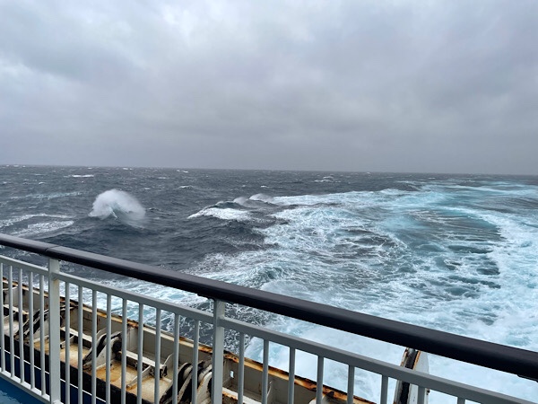 In Lizzy’s defence by the time we got out of the sheltered Plymouth harbour, the wind and sea state was really building. Some of our dog walks featured some very impressive sea states as the trip progress the wind blowing the crests if the waves and massive breakers hitting the ship beam on creating massive spray and noises through the ship. Having crossed these waters ourselves in a 36ft catamaran in mirror calm seas from a carefully selected weather window, we were very thankful to be in this sea state in a much bigger vessel with a professional crew as I am not sure our boat would have made it.