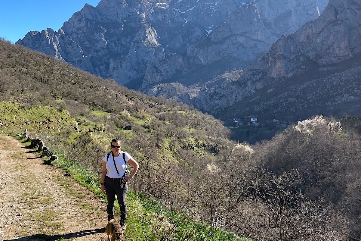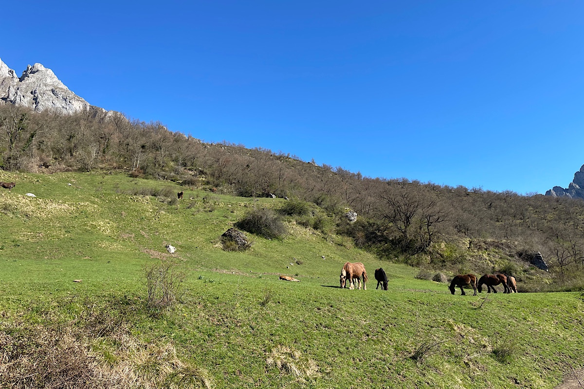 We we followed the route through fields with mountains each side, passing the lake and free roaming horses (“Caballo” as per my Spanish homework told me before we left). It was a lovely walk on a well marked track. We hit the road to cross to Cordinañes village when we realised that the track led to the village only, not the viewpoint we wanted to see. We had passed an apparent fork in the track a couple of hundred yards back (uphill obviously). So Kev decided we must have to go back there for the viewpoint. I suggested Google Maps, but he was sure, the previous track leading to the highest point locally, where you would expect a viewpoint to be. Well after a scramble through brush and bramble up a goat track, expecting to find the road past the mirador, in fact we found the top of a hill with gorse the other side. We could see the road many meters below us in the distance. On the plus side, we saw what we can only imagine was a golden eagle (they do live hereabouts) soaring in the thermals above us. Obviously we were far to slow to get a photo.