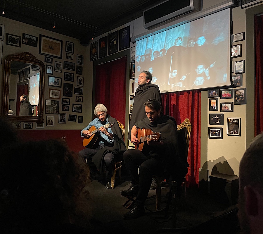 Introductions were in Portuguese and English for the two guitarists – one on the Coimbra specific guitar which is between a Spanish guitar and sitar, accompanied by a standard acoustic guitar. Apparently the music originated from the need for male students to serenade their loves, Romeo and Juliet style from the balcony / window. Sadly, as one cruel observer (who shall remain nameless) concluded after the concert, it would have driven them to jump from the balcony as the singing was rather doleful 🙄🤫😳 Nonetheless it was clear to recognise the talent of particularly Jose on the Coimbra guitar. However, to our uncultured tastes, probably 50 mins was enough.