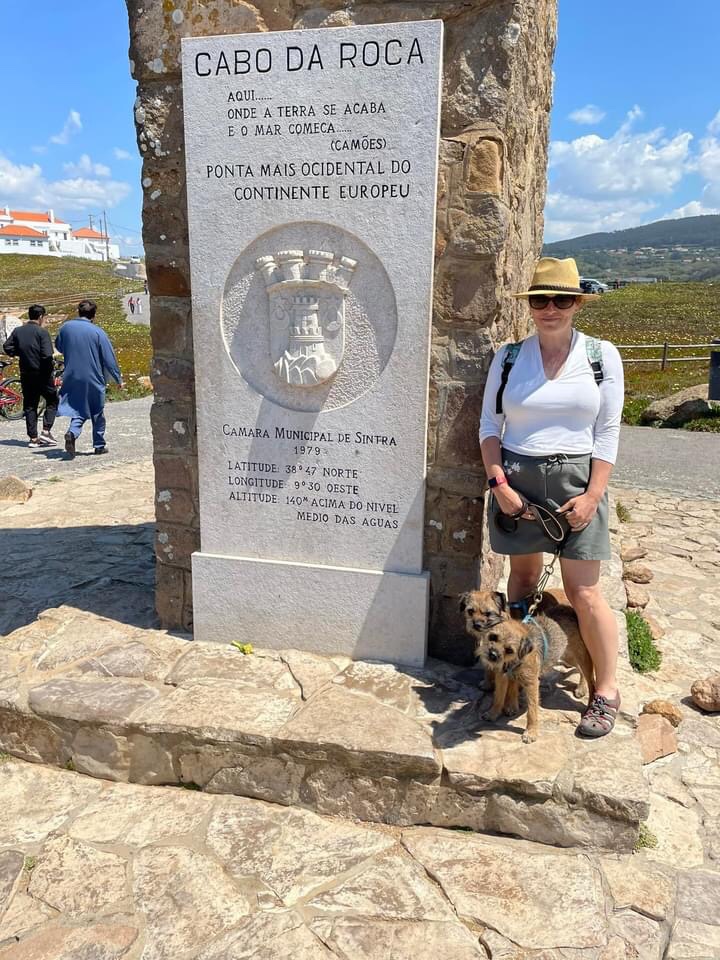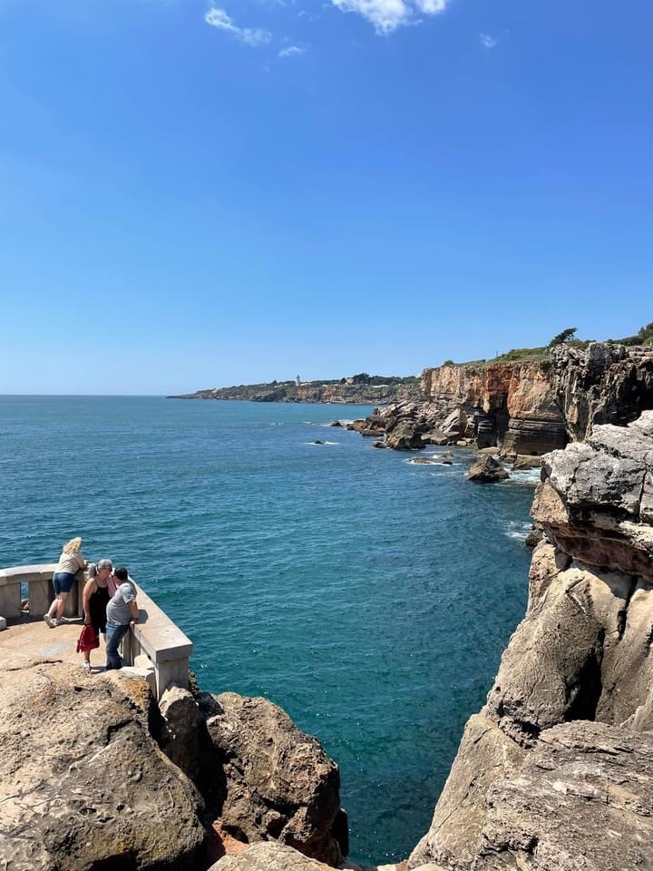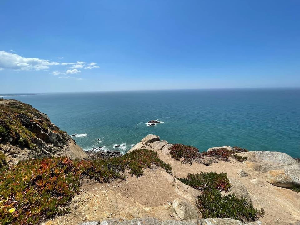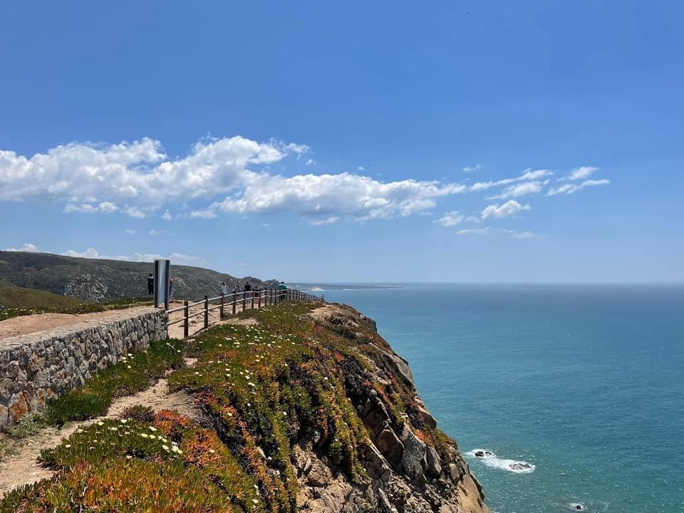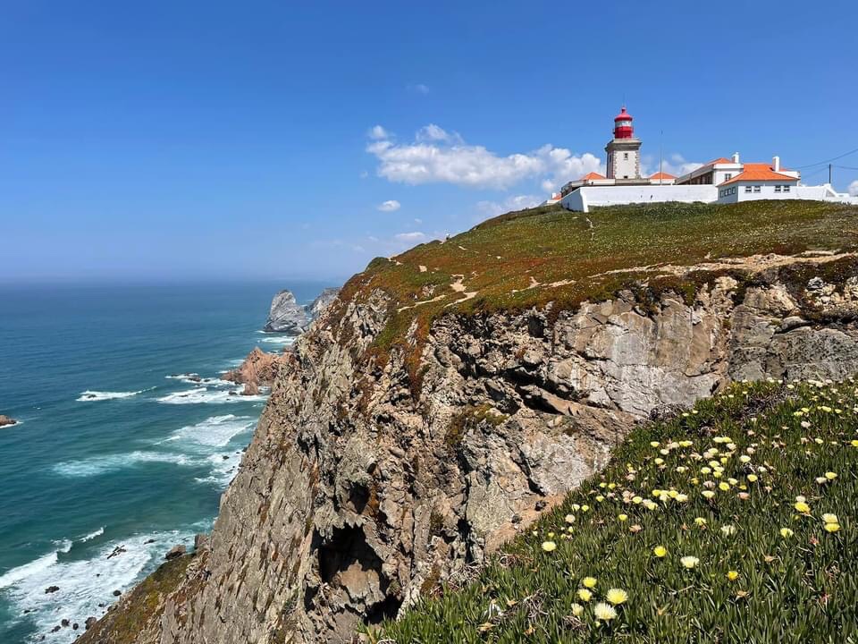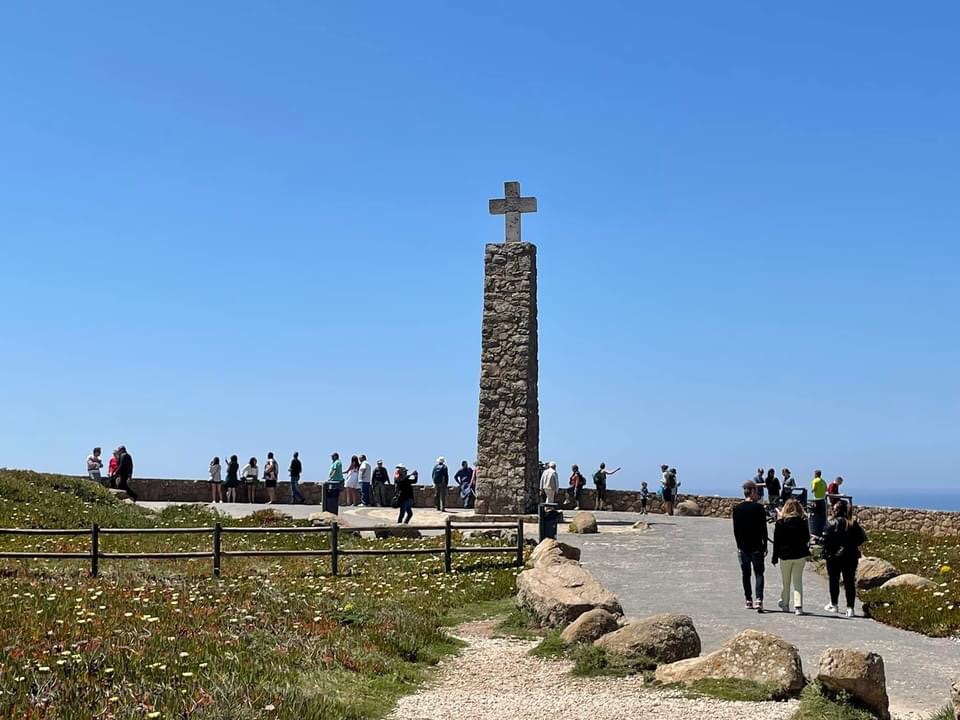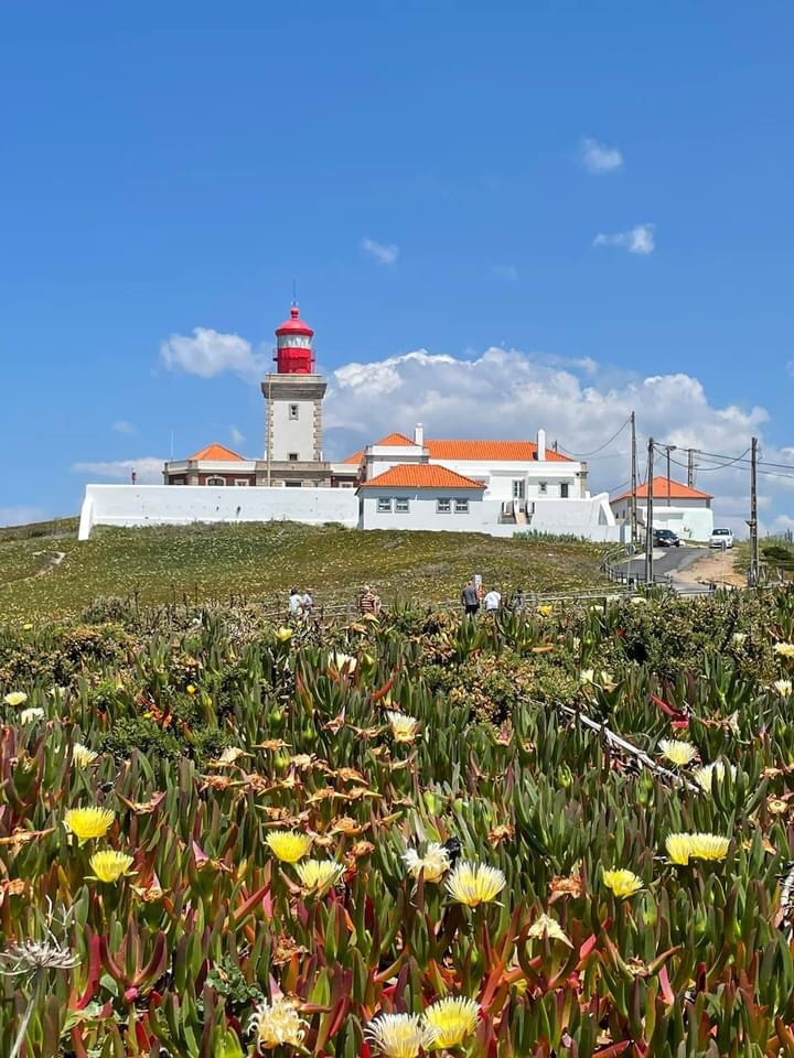 Eventually after a coffee stop, we headed out to the coast at the steady paces of the 🛺 letting the cars pass us and the sea breezes flow through. Next stop Cabo de Roca, the western most point of Central Europe and another of the lighthouses ticked off from our sailing route in 2008. We stopped off for photos in the bright sunshine, the whole coastal area is covered with the spectacularly colourful ice plants. We get these too in Cornwall but not in such large areas. The coast line and cliffs are picture perfect and we posed for some photos next to these iconic spots.