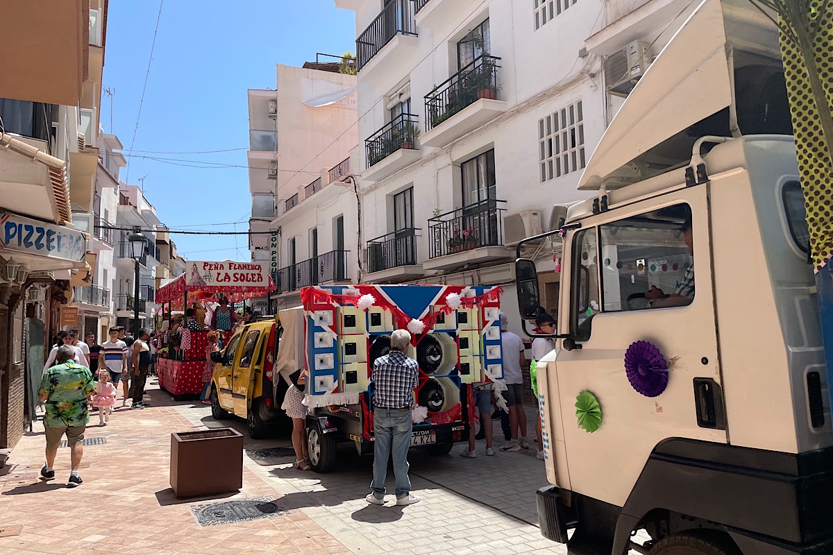 We headed into Nerja at lunchtime, we had seen a couple of horses riding up the road behind us with the riders in traditional dress. We wondered what was occurring only to find there was a fiesta in Nerja today and if we head in now we should see it. We walked along the beach until we hit some shade for the dogs and headed toward the centre. There we found a very long queue of floats and hundreds of locals dressed up for the procession but no horses. There was big crowd, all the women in variations of flamenco dress. Everyone was in groups chatting and having fun. The music was thumping. We had clearly found the party. There was great family atmosphere as all generations were involved and enjoying the event.