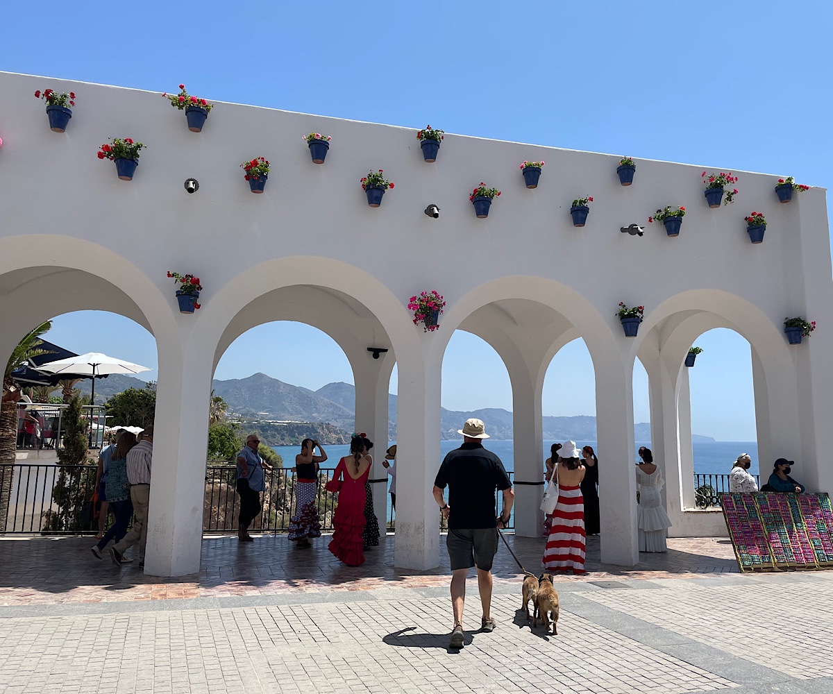We managed to fight our way through to visit the famed Balcón de Europa and enjoy to fabulous views but it was hectic everywhere. The sun was getting warm and Lola was ready for some shade so we dived into a tapas bar so we could have a late lunch. The only spaces were in the sun, but provided shade under the table. We thought we could bear the heat better than the dogs, so they stretched out under the shade of the table.