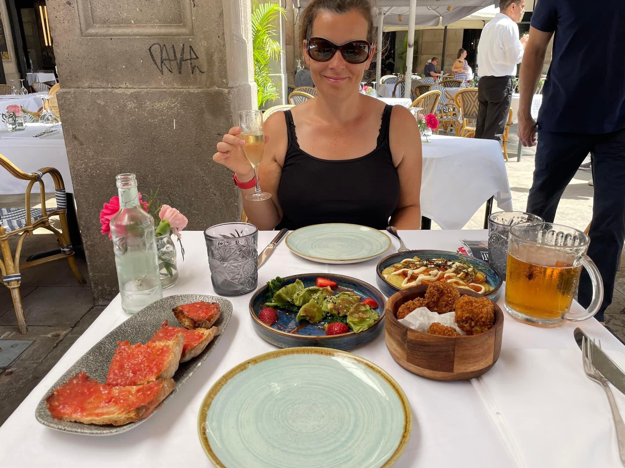 We finally decided to head towards a restaurant which had been recommended by our waiter at the campsite the night before, from the literally thousands in Barcelona. The Quinze Nits (15 nights) was in a lovely little square called Placa Reial, full of palm trees and lovely old architecture plus a little market. It was by now beginning to fill out for lunch and time for a rest stop for the dogs so we decided to take a early tapas lunch with a beer for Kev and a lovely glass of chilled Cava for me. We would never of chosen this place based on Trip Advisor reviews, but had an excellent lunch with a modern twist on traditional Spanish. We have certainly learned that the tastes of the average trip advisor reviewer does not always align with our own, great to get a local recommendation. However, we did see another couple of people from the campsite bus there though so, perhaps it is just owned by his cousin or something 🤣 We don’t mind if the food is good 😋