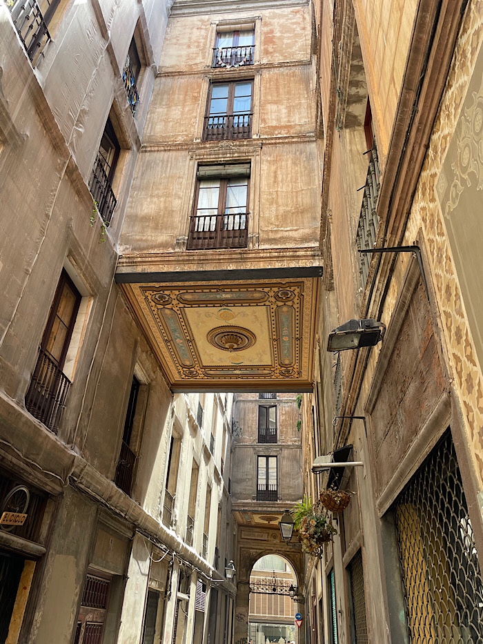 The coach dropped us on the edge of Plaça de Catalunya right in the centre and north of the old Gothic Quarter with its tall, narrow, shaded streets full of restaurants and independent quirky shops, ideal for wondering with two dogs more used to the English climate. We strolled a little down La Rambla first, the famous pedestrianised tree lined, mile long main shopping street of Barcelona. Not being big shoppers we quickly cut into the narrow streets of Barri Gòtic looking for coffee, with lovely architecture and cast iron railings on flower strewn terraces. This was obviously a city with serious affluence in the past. However we managed to find I think the only area of Barcelona without a coffee shop every other shop. However there were all sorts of quirky arts, craft and quirky shops including one which just sold rubber ducks of various characters and costumes. We also saw the original La Cathedral, now overshadowed by La Sagrada Familia, which dates from 1298 but with an impressive gargoyles strewn gothic exterior added in 1887-90.