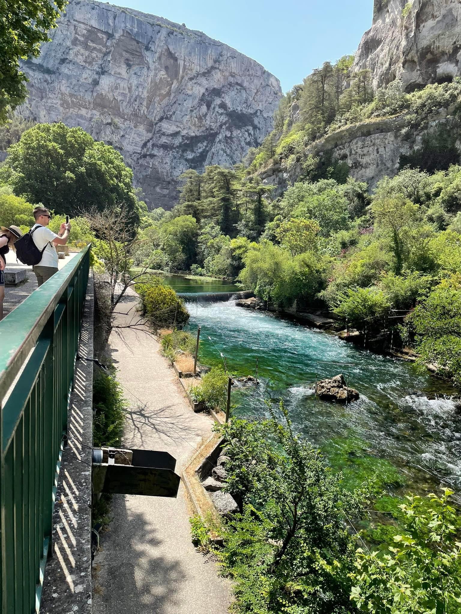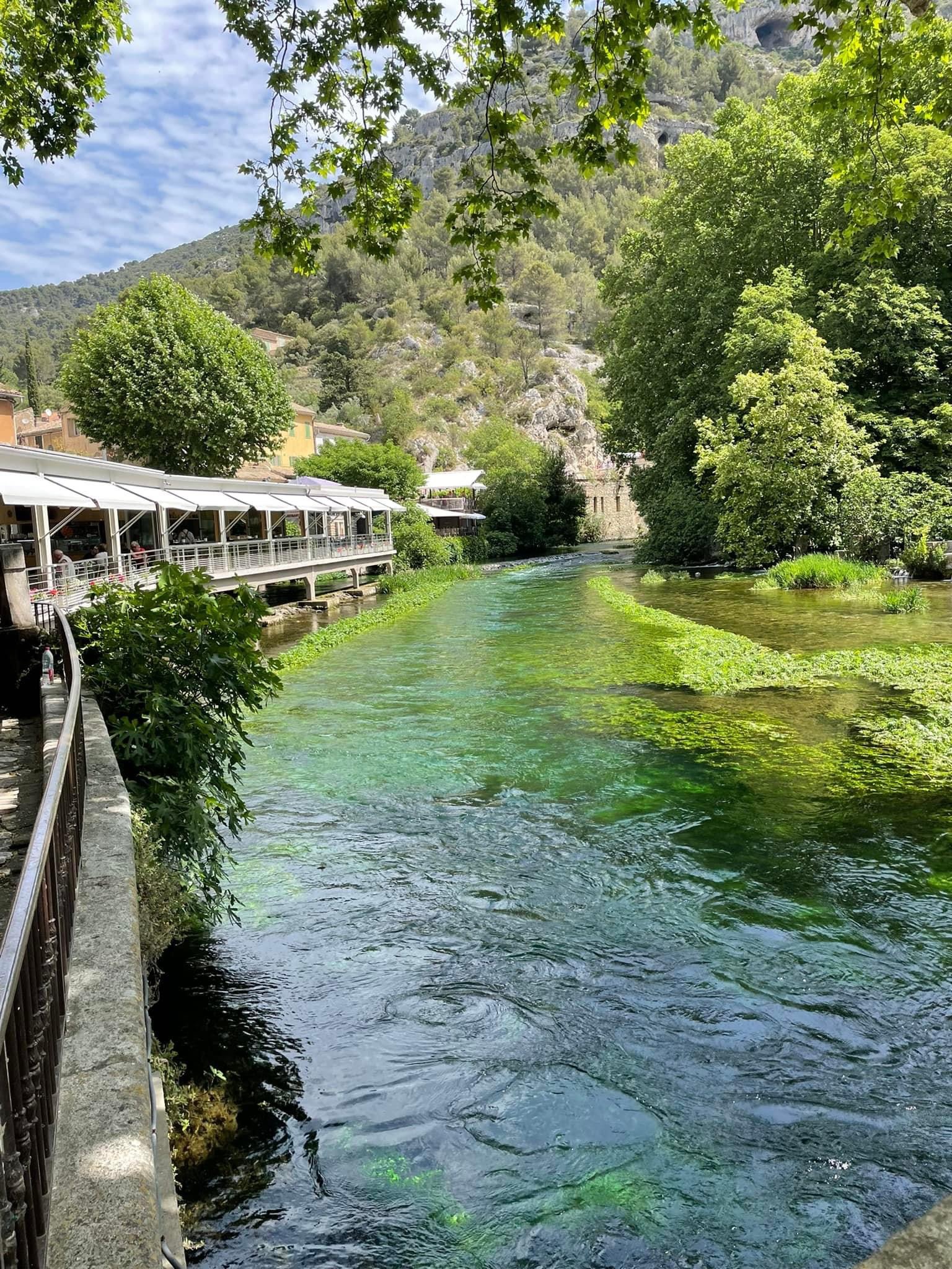 We then headed to the main attraction of the village (and I hope the reason this village in particular is so busy), the spring source of the Sorgue river which pours from a network of underground caves. Apparently Jacque Cousteau came here years ago with a submersible to try and find the bottom years ago and did not find it. A probe years later measured 308m depth. It is said that all the rainwater from the Luberon and other surrounding mountains comes out of this one source, making a catchment area of 1100 square km (425 sq. miles). During spring or very heavy rainfall it lives up to its name, with water gushing out at 200m3 (52,000 gallons) every second – this is apparently one of the largest springs in the world. It takes amazing aquamarine blue photos when the sun is on it but we did not quite time it correctly for that. A natural beauty nonetheless though very busy with visitors.