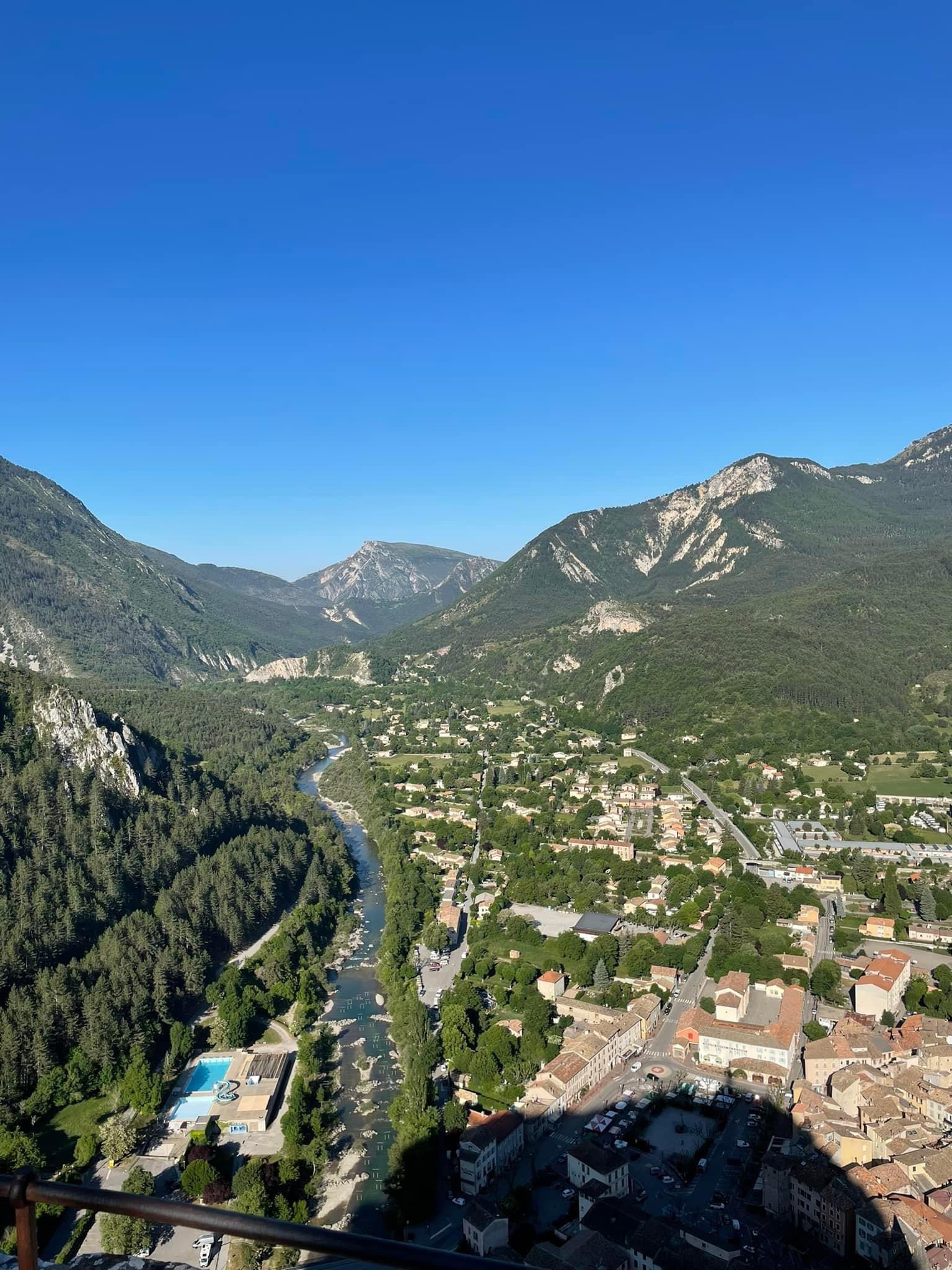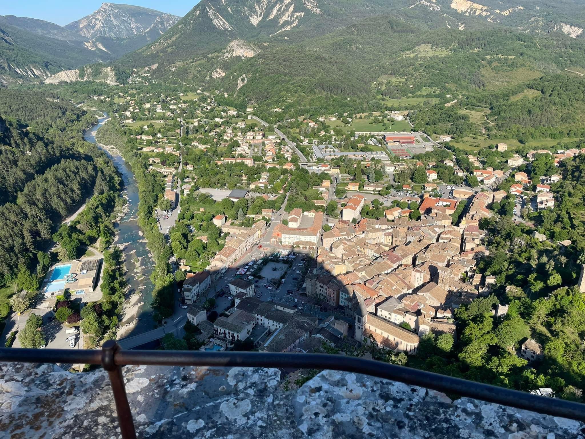 The walk only took 30mins in the end, obviously almost entirely uphill, thankfully still catching the early morning shade of the Roc on our ascent. There was some fairly vertical drops to the sides of the path, although railings were in place for the worst it was definitely an on-lead dog walk. We failed early on the vertigo test which was to be tested even further later on in the day. The views from the top of the surrounding mountain range and across Castellane was worth the effort. It is slightly unbelievable looking back up from the carpark later to think we got up there so easily.