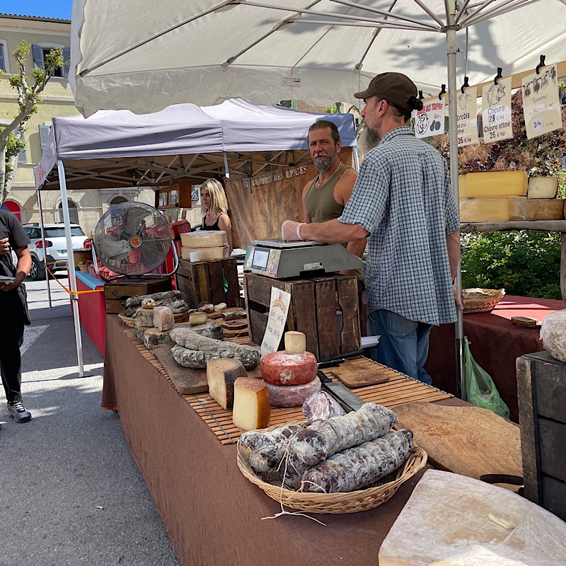 When we got into town square again, we were thrilled to find a farmer’s market on the square. We had a quick wonder round and the the fruit, veg, meats, cheeses, rotisserie chickens, spices etc etc looked fresh and supersized compared to home. We were positively drooling but we had not brought a wallet and had not yet had breakfast. However, that situation was soon rectified and we set off with multiple shopping bags. Kevin was thrilled to sample his way to selection of our purchases. We got local strawberries and the famous Provençal melons (June being the premium time to sample), cheeses and an amazing piece of cured fillet beef.