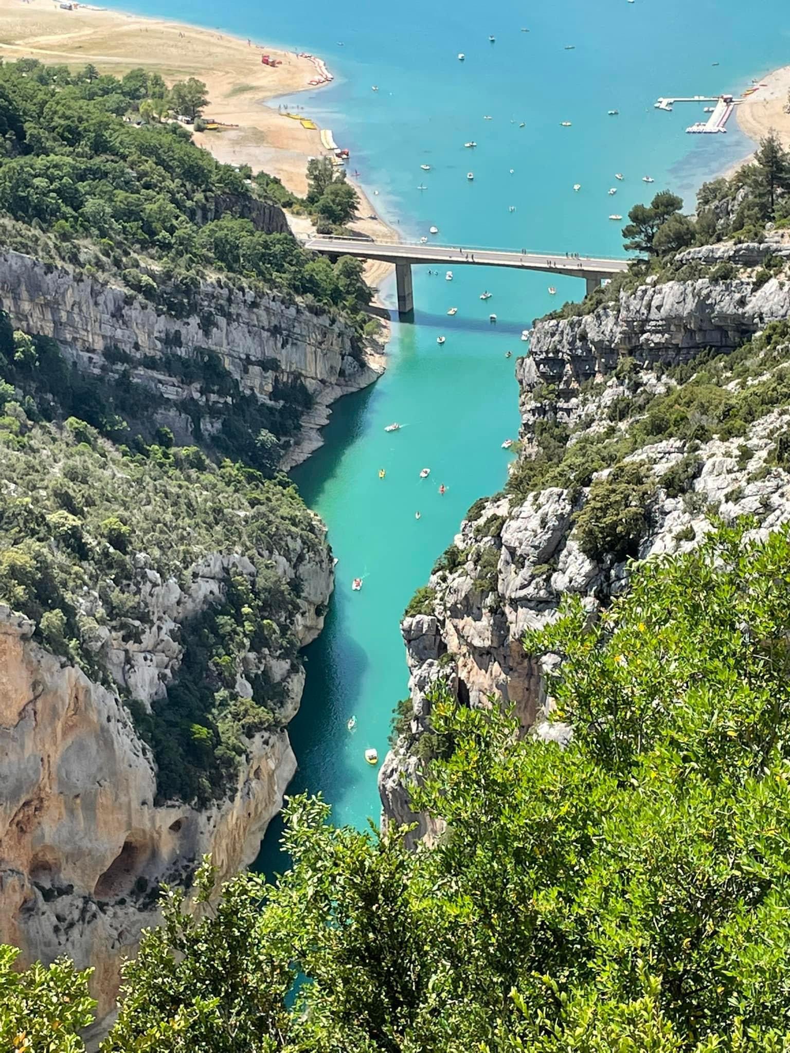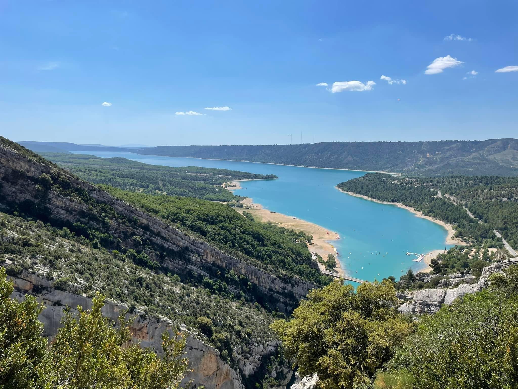 It took a couple of hours to get round the route including picnic lunch from the market and photo stops. A truly spectacular day. However what a drive! Sheer drops, near 180 degree hairpins variable road widths and cambers. Kevin was therefore not so keen when I suggested we extend the drive to the head of Lac de Saint-Croix at the end. However by now it was my turn to drive. Another 16km of mountainous driving brought us to the viewpoint which was worth the extra drive. It was obviously a popular spot the water was filled with kayakers and paddle boats etc. The idyllic turquoise blue water and sandy shores certainly looked appealing after all that driving.