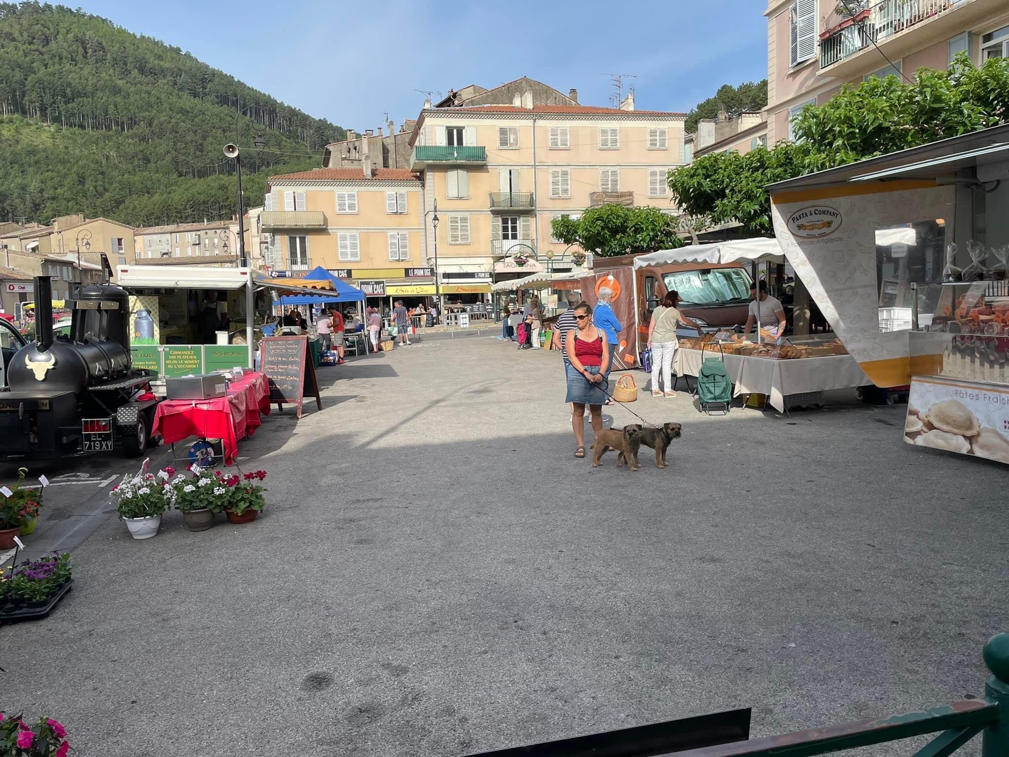 This morning we were out before breakfast to make the most of the (slightly) cooler morning. Two expresso in the café with the other locals contemplating their shop at the Saturday market. The Sisteron market is arrange around the clock tower (l’Horlage). Along with the abundant local fruit and vegetables piled high on the market stalls there was also a number of stalls which were cooking large vats of food for lunch, enormous paella’s piled high with seafood and chicken, the obligatory rotisserie chickens but also large mobile ovens cooking lamb and ribs. A little too much for breakfast, we tried the local Provençal ravioli like squares on varying fillings – potato, goats cheese, spinach, blackcurrant, apple, Saint Jacques (cheese and ham).