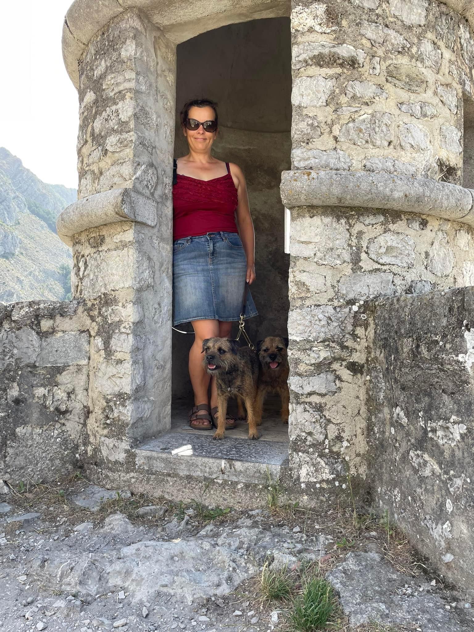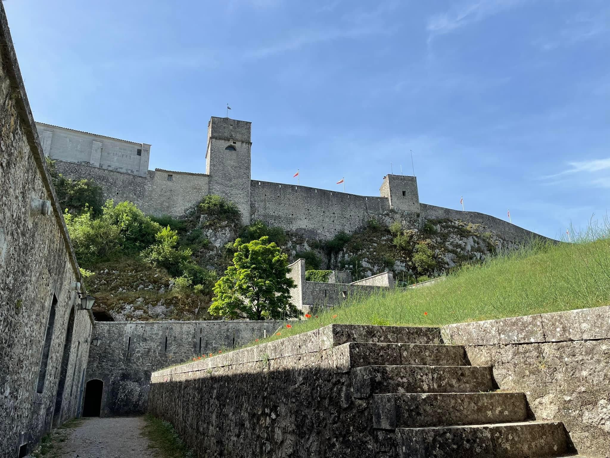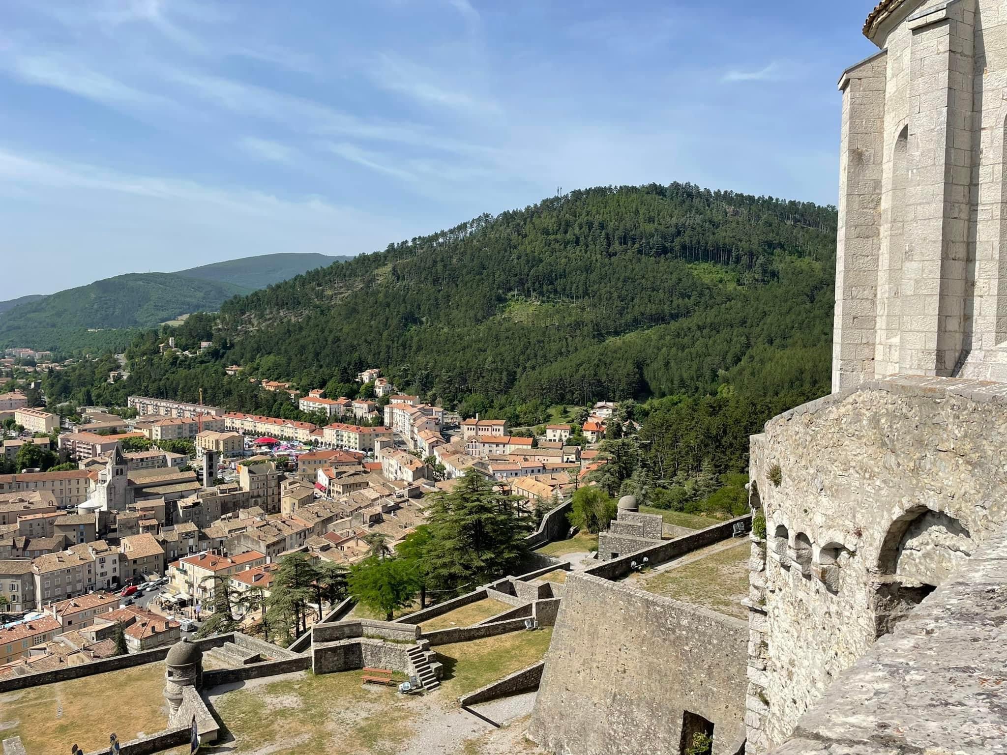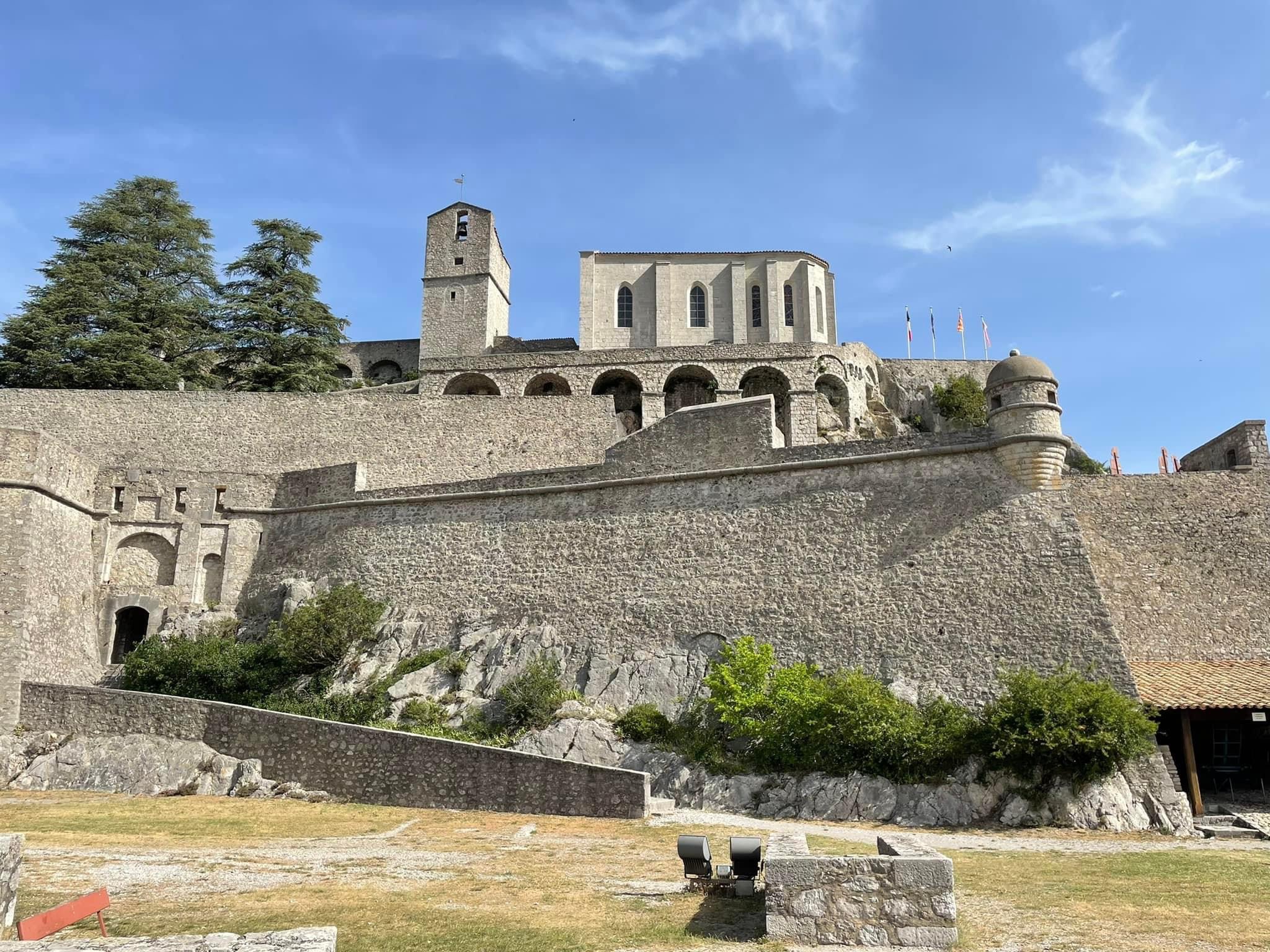 We paid and entered the Citadel, dogs also welcome on a lead. We mounted the stairs to the first terrace and already we were rewarded with fabulous views across the town and the river Durance. The citadel dates from the 13th century, though updates and additions were made as late as 1860, including by Vauban of French citadel fame whose works we have seen across France. The structure includes a chapel, bakery, sentry boxes, armaments stores, staircases chiselled out of the bedrock and even a theatre which was added later. The tour in the form of arrows to follow takes you right to the chapel at the highest point with a narrow rampart wall along the ridge giving views north and south and a lovely breeze after several flights of stairs. Reputedly, the view from north to south from here is over 150km, helped by the presence of some very large Alpine mountains in the distance. It is a very impressive bit of civil engineering, how they have used the bedrock foundations and the geography of the natural ridge to form the structure.