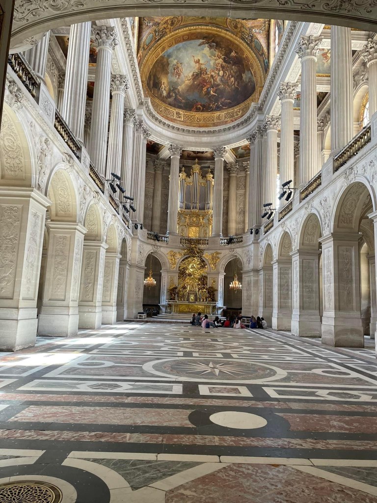 We entered on our pre-booked time slot to visit the Palace. The free audio guide comes with the free app for the state rooms, though you would need a couple of days to listen to the whole set in full. We were content to just wonder through the main state apartments of the king and queens chambers where the elaborate etiquette of court which was created by Louis XIV were performed. The king and queen were individually awakened in their state bed chambers (the king also had a separate actual bedroom) in separate wings of the Palace attended by the privileged members of court. The separate procession then met in the 75m long Hall of Mirrors built to reflect gardens and the setting sun. Onward to the royal chapel for prayers, where the king sat above the crowds and the priest on a separate mezzanine level.