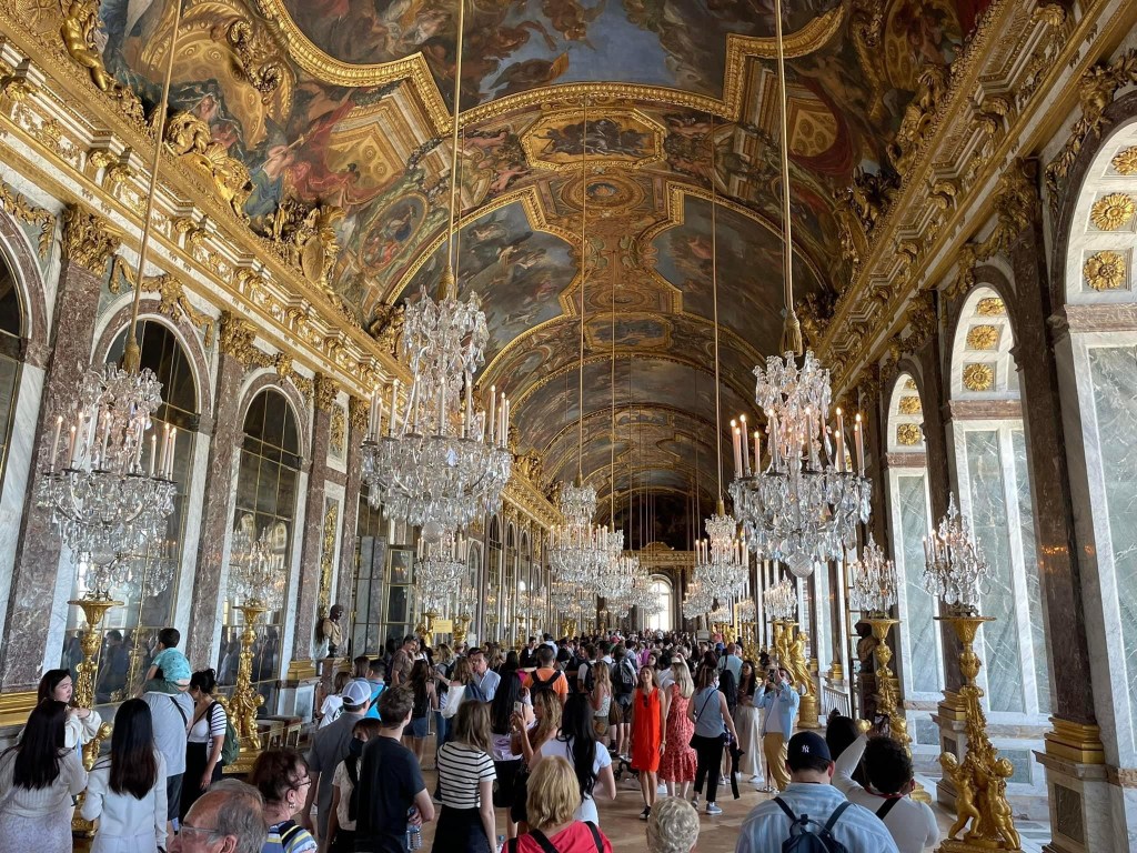 One missed turning and a u turn in the middle of Versailles made for a slightly stressful arrival. However we managed to get shaded parking and after another walk with the dogs we set off on the 10 min walk to the Palace. Sadly the initial impression was slightly impacted by scaffolding on one side of the building which is from a €400M Euro refurb project which was originally due to finish in 2020. We struggled to get the whole frontage of the building on one photo, it is that large. There is gold leaf edging around the central part of the building which houses the State Apartments and vast golden gates and rails ahead of that. It is really difficult to explain the level of grandeur. Opposite the building there is the former stable buildings and there is also another buildings in the garden, Grand Trianon built for the family to escape court, a home for his mistress and mother of 7 of his estimated 19+ children (6 with his wife though only 1 survived to adulthood). There was even later added a mock hamlet where Marie Antoinette (wife of his grandson Luis XVI) played at being a milkmaid.