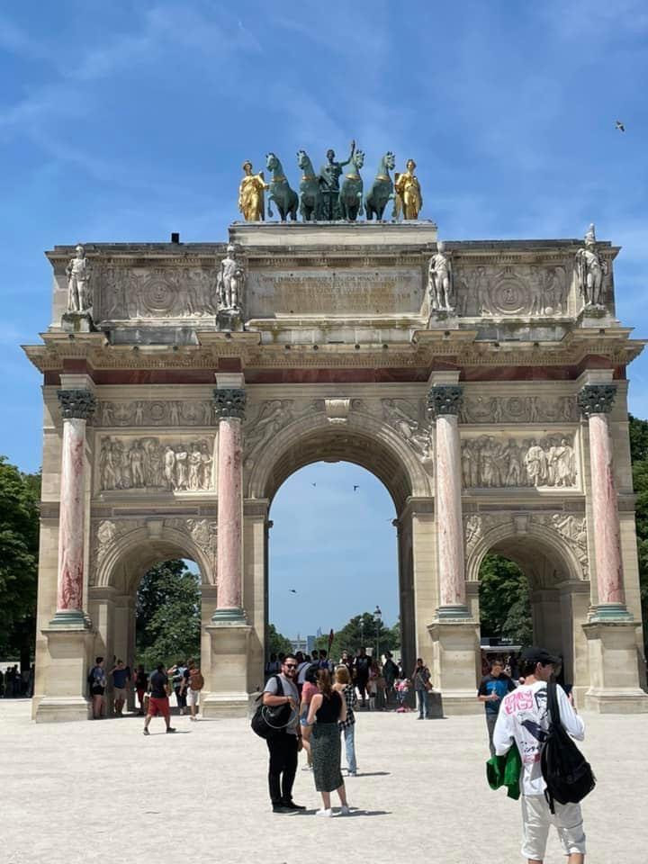 First stop of the day the Arc de Triomphe, inaugurated in 1836 to commemorate the fallen in the in the French Revolutionary and Napoleonic Wars. It sits in the middle of the maddest roundabout ever, the Place de l’Étoile. A junction between 12 avenues and gloves-off traffic control of beeping, nudging and outright pulling out which is amusing to watch. We thankfully could take a subway to the Arc de Triomphe for some closer up shots, where we were told first by security then by the police that no dogs were allowed. However, we were allowed to carry them. I can only assume this is as the French do not appear to be good at clearing up after there dogs.