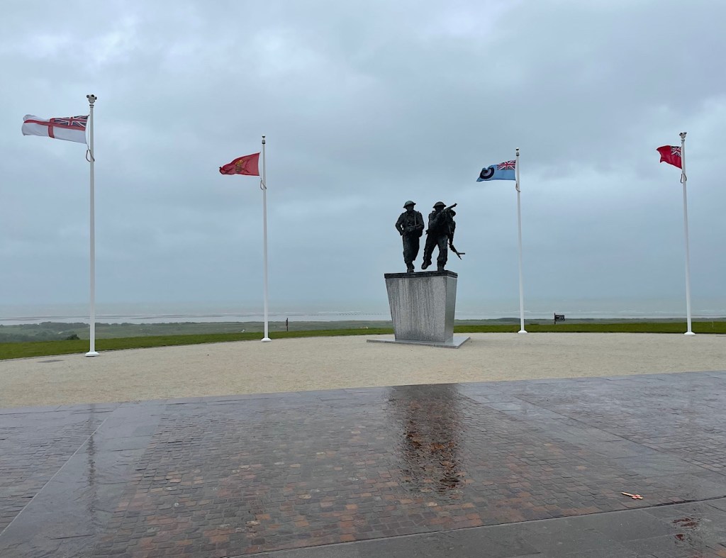 When we arrived at the memorial which overlooks Gold Beach, the rain was lashing down. It seemed atmospheric based on the conditions the men experienced on D Day. The moment is really well done, there is a large parking area and then on the walk to the moment there are large stone plaques which tell the story of the invasion, the victories and the defeats of the Normandy campaign of 100 days.