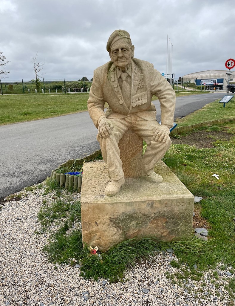 We moved on to Arromanches-Les-Bains, the far end of the Gold beach landing area. We parked up at the Aire on the cliff top overlooking the remains of the Mulberry harbour which was installed to support landing all the heavy equipment needed for to support the landings. Such a good job was done of the installation that several sections remain in place today. On the cliff top there is a beautiful memorial commissioned for the 75th Anniversary to commemorate the veterans still remaining which shows a really graphic image of the invasion watched over by a stone statue of Bill Pendle of the veterans looking on at his 22 year old self.