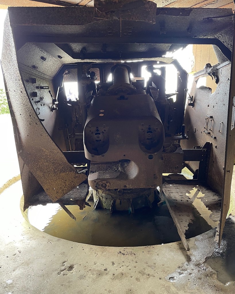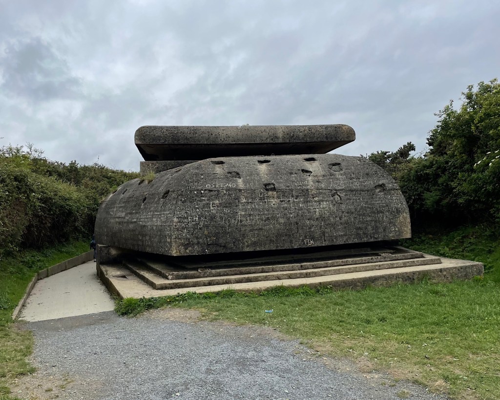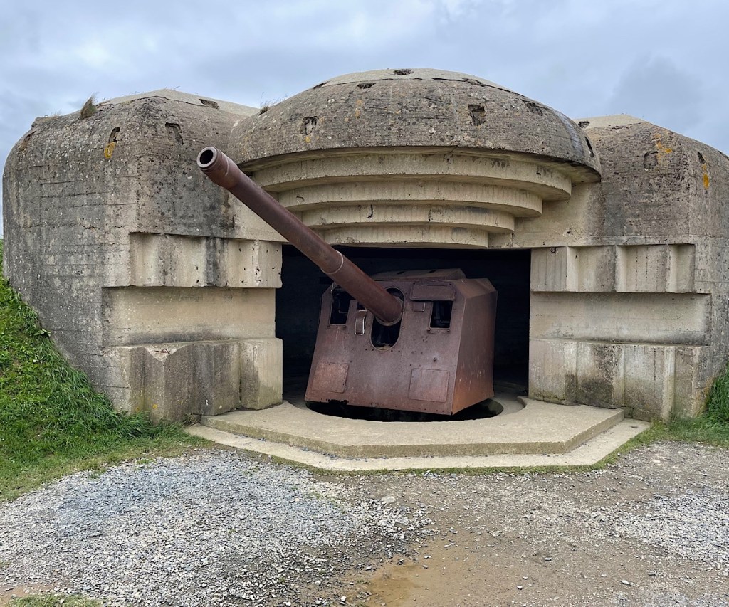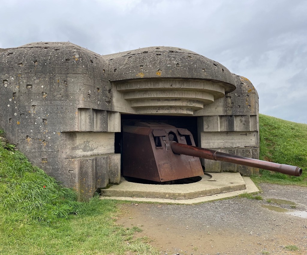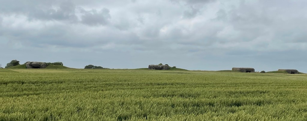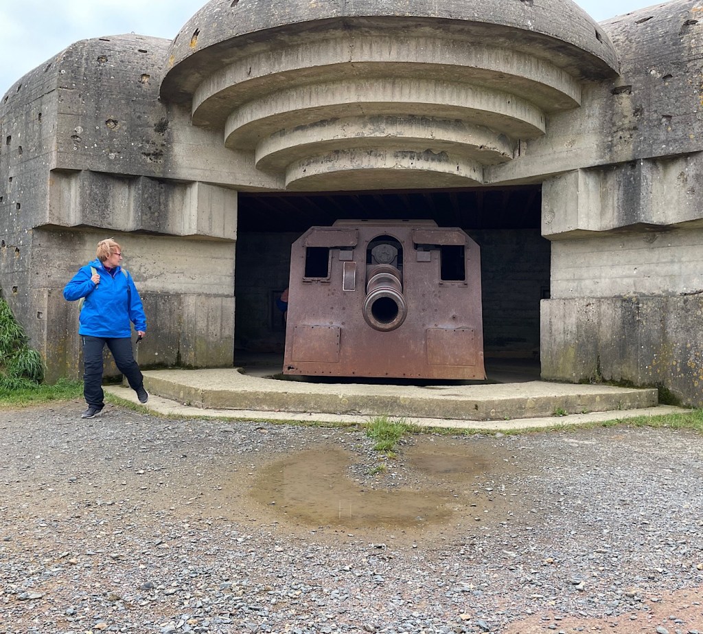 After coffee and crepes it was time to hit the road again. We went to visit Longues-sur-Mer Gun Battery. Located between Gold and Omaha beaches, it was an important target for early attack to protect the landings on those beaches from its four 152mm guns. It was fired at by a combination of Allied ships to finally put it out of action on 7th June, it’s garrison of 184 men surrendered. The are the four gun emplacements, still with guns in place and a garrison slightly further towards the coast. They seem to be as they were left complete with shell holes. After watching The Longest Day and Major Pluskat at his battery, it was interesting to go and see, giving a bit more of a German perspective to the offensive. Although according to Wikipedia, Pluskat was not actually with his troops that day so the film was not quite accurate.