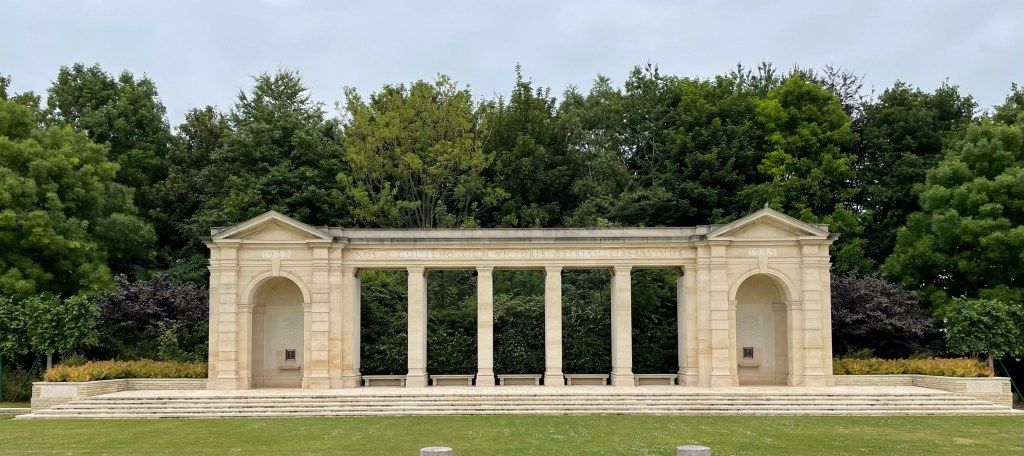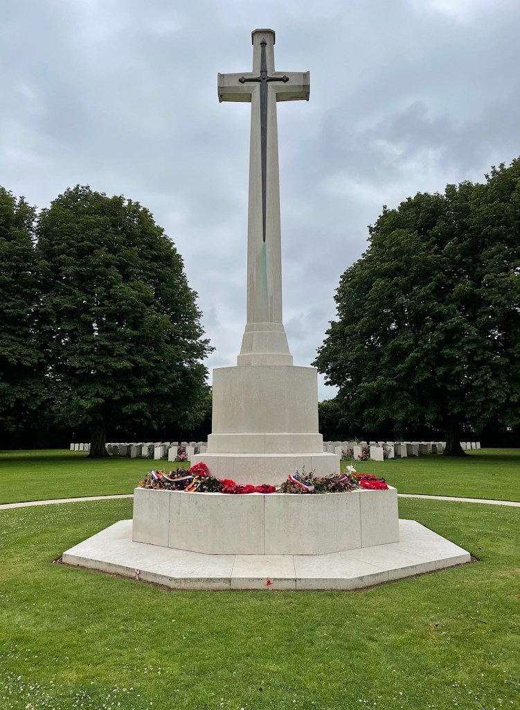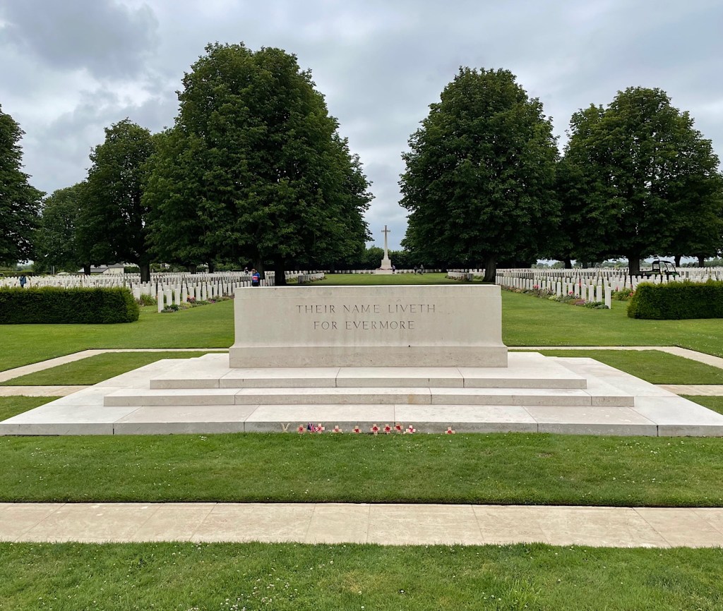 Finally, onwards to Bayeux, where we easily located one of the two aires in town. Our first visit here was a more somber and reflective one at the Bayeux War Cemetery containing over 4100 Commonwealth servicemen. Opposite stands the CWGC Bayeux Memorial which honours almost 1800 service personnel who died in the Normandy Campaign who have no known grave. That seems a shocking percentage and probably tells something of the brutality of the battle and the conditions in which they were fought. Even within the cemetery there were many graves which were unnamed. I cannot imagine how awful a task it must have been to be responsible for these burials. However, the end result is immaculate and a very fitting final place of rest with beautifully carved headstones of pristine Portland stone and immaculately kept grass and well places roses and other flowers. We located Leonard Penney, whose name was on the British Normandy Memorial and thankfully was one of those who did have a marked grave in the cemetery.