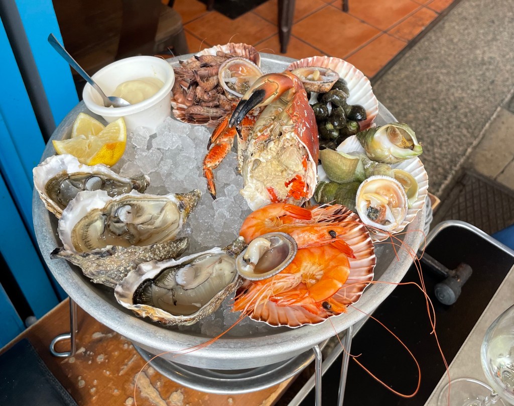Today was sadly rather grey with rain forecast. However we managed to make it all the way in without getting wet and found a delicious espresso before locating our favoured restaurant. We scoped out Le Panier des Crabes, recommended by Lonely Planet, apparently run by a local seafarer. However, as all the seating was outdoors under a tree and rain was forecast we moved on. The famous André restaurant we remembered from our 2008 visits with its pavement side seafood display / preparation area. Since we had last visited they had expanded into several neighbouring shops, however, the seafood platter on the menu was not as good as the restaurant we visited the day before which was 2 doors away. So we returned for Kevin to try the platters he had seen being served the day before.