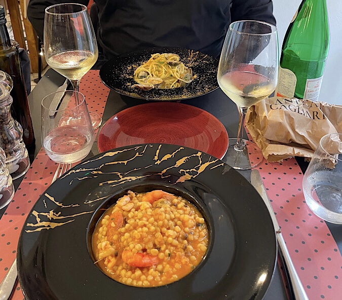 We had hoped to make amends on our dinner last night with lunch today. However, with 900+ restaurants in Cagliari we had reached analysis paralysis on the reviews. The mix of ecstatic to terrible, all for the same place. Top ratings for snack bar type food, really not matching our intentions. We decided to have a wander instead which was probably just as random and involved a fair bit of tracing and retracing our steps. Eventually we settled on a fairly traditional Italian menu at a smart enough looking restaurant. The food was delicious and the place was full by the time we left so we were happy with our choice. We got to tick off a couple of Sardinian specialities we had not tried too – Bottarga made from fish roe and Fregola a North African inspired couscous-like pasta.