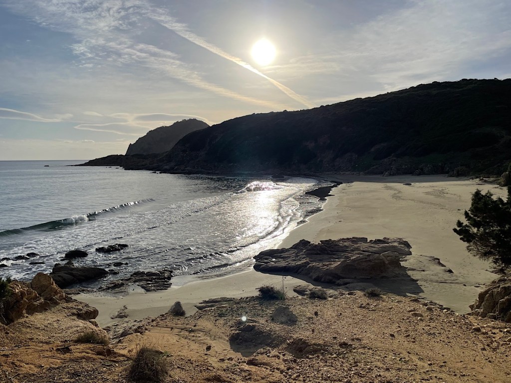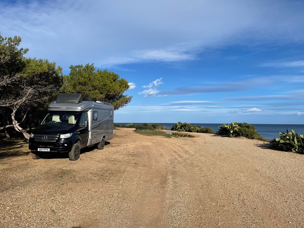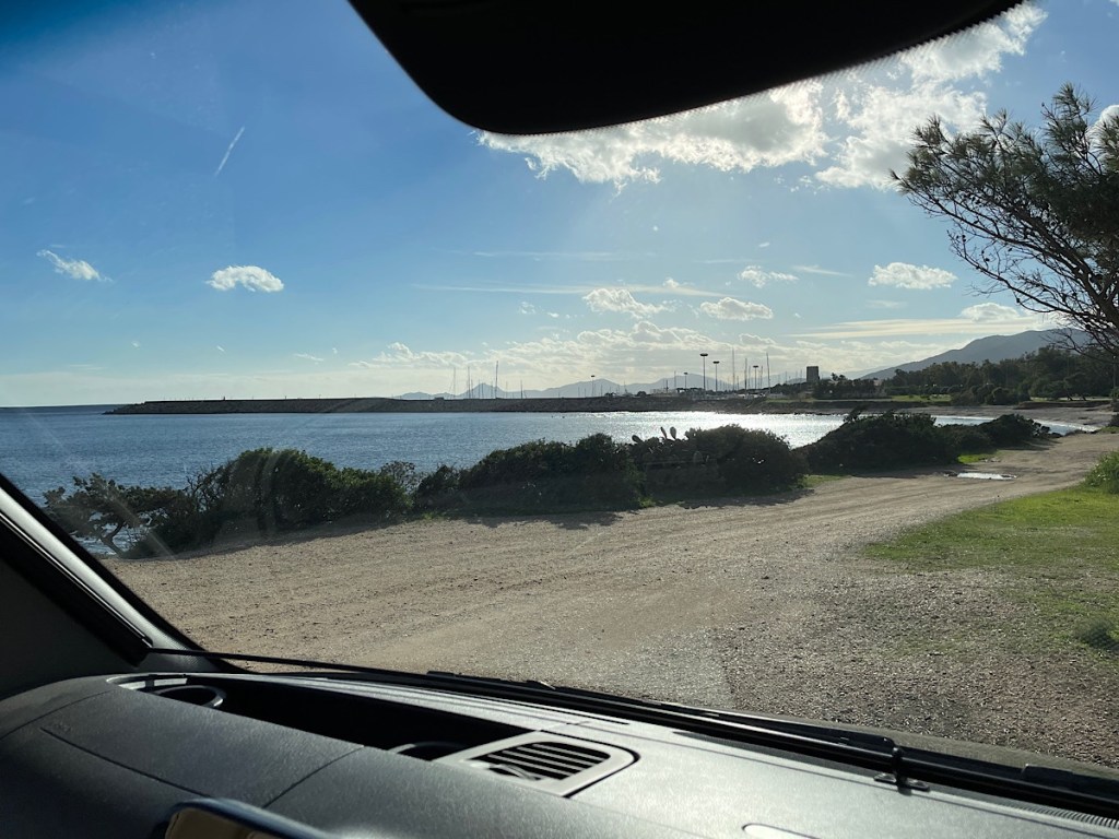 Although it was nice and peaceful in our beachside stop at for Feraxi, there was not a good combination of level ground to park and clear skies between the trees for our solar panels. So we decided to head slightly further north and we are now parked up by the sea at Porto Corallo about 30 minutes drive from our last stop. We were given a touching send off by a local happy looking dog with a bell round his neck who followed our slow progress down the rutted track, no doubt his standard farewell to the occasional visitors.