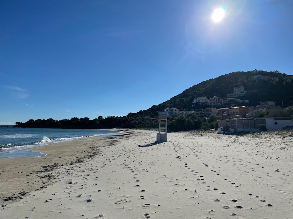 When I got back we decided to move a little up the coast to a small campsite in Foxi Manna. Run by a young couple who are very welcoming and who have been busy working all day on what looks like it will be a small bar. They provide all services including washing machines at 10€ a night. A gap in the perimeter fence leads you straight onto a lovely beach with powdery sand and mountain backdrop. We have passed a pleasant day with beach walks, yoga, Italian lessons, Kev went for a local reccie on his bike. Bar located 😂