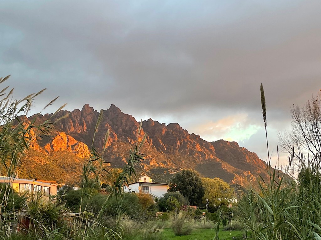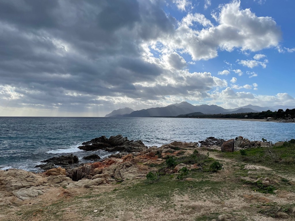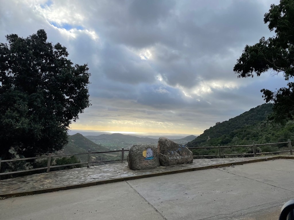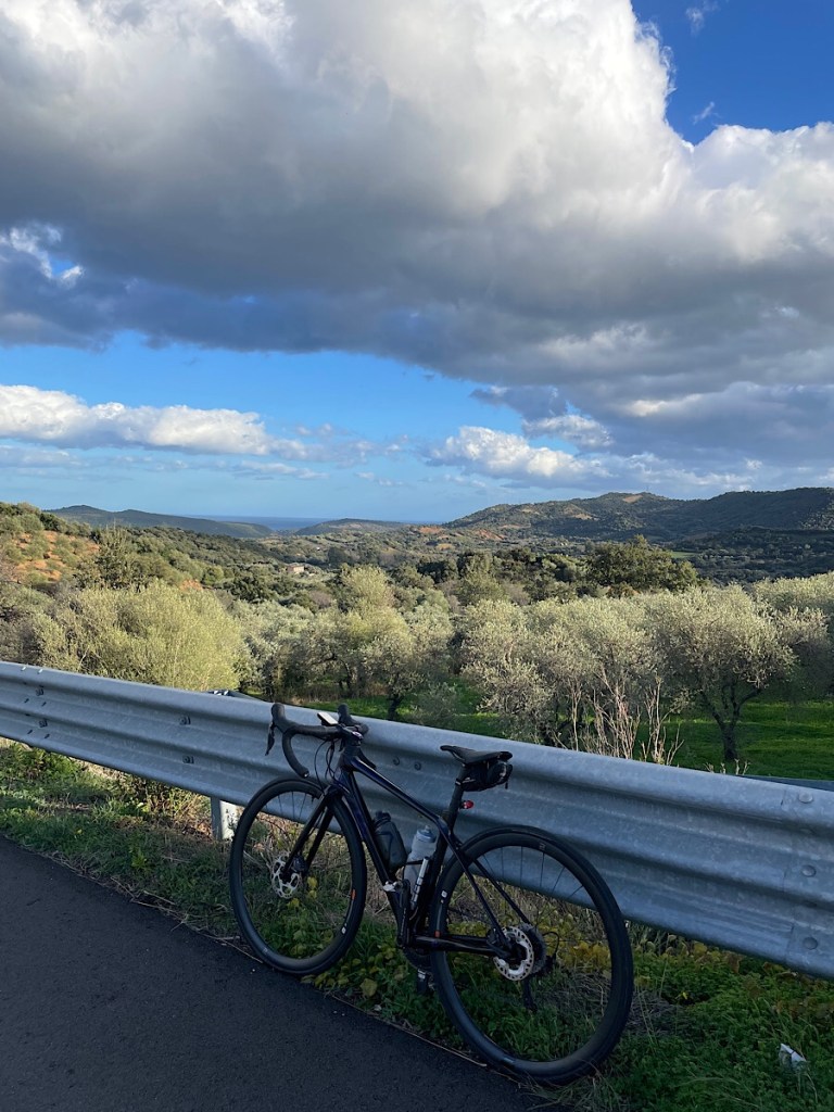 A tourist brochure at the cafe talked about the narrow gauge “green train” which literally goes through the mountains near here. It must be quite a route by train, it seems to have multiple hairpins to get there. They even do a wine tasting route in the summer which makes multiple stops to taste the local wines made on route. It sounds great! Sadly it closed in September for the winter as it seems they do get snow on the hilltops round here in the depth of winter. However, a pharmacy sign in Bari Sardo I passed today was reading 24.5 degrees so no sign of snow yet. I knew it was hot cycling up that hill!