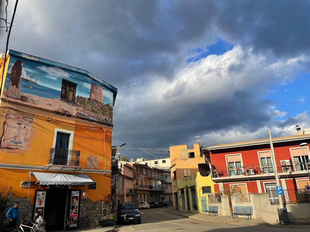 I worked out the old ex-SS125 cut across the loop of my route here so I followed that with the Sat Nav bleeping to u-turn until I reached the other side of the loop and was able to follow it back to the campsite. Only 16 miles in the end, but still a bit of hills and some very determined head winds. Bari Sardo town had some pretty parts with colourful church domes and wall murals which we did not get to see on our drive through.