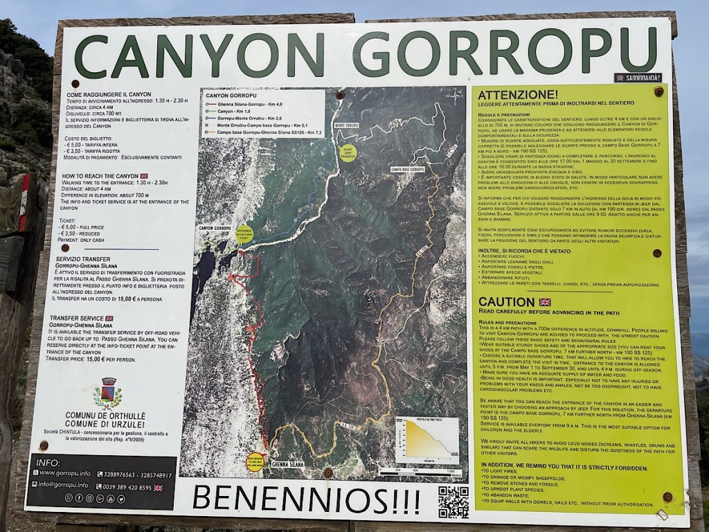 The signs said it was €5 to enter the gorge and the ticket office was at the bottom of the 700m climb, a 90 minute walk. The bar, hotel etc at the top were all shuttered closed, apparently for weeks. All indications on line though suggested everything, except the bar was open but that is no indication at all from experience. I tried calling and a What’App message to the jeep company / official Gorropu site with no answer.