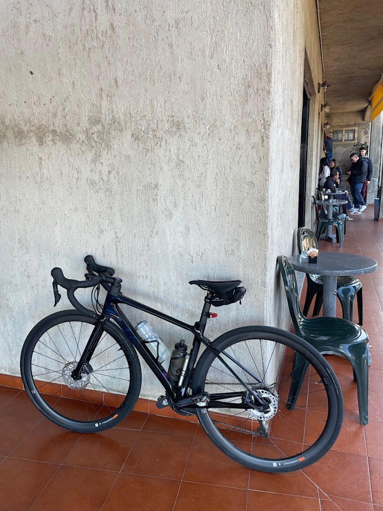I had now added quite a bit of time and was in need to the loo. I decided as I was wearing bib shorts with braces, the sensible option was to find a cafรฉ and grab a coffee, not least because we have cracked the glass on our coffee pot and I was missing my daily shot. I carried my bike up the steps and left it by a table and marched in to the very busy bar / cafe with my purple face (Loiri is on a hill) and my cycling gearโฆ which just happens to be in England Rugby colours. I did get a few bemused looks from the mostly male clientele ๐ However, I did get a a really very lovely smooth coffee โ๏ธ๐