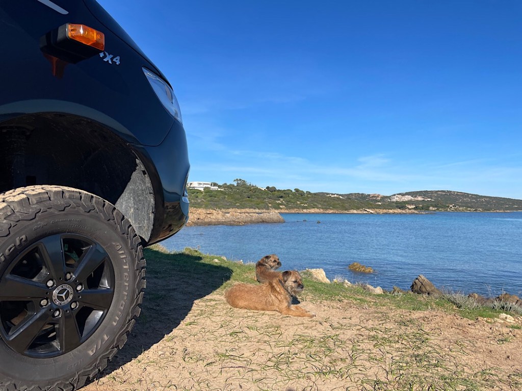 We walked over the the beach as Kev took some fabulous photos and the girls went exploring. I manned the head torch and the dog poo bags… leave only tire tracks. it was quite along time after that the sun emerged behind Isola di Tavolara by which time it was well after sunrise. We had a lovely leisurely morning, I finished my book and did some yoga. Kev was busy fishing off the rocks and then washing the van. The weather continues to be lovely, with bright blue skies and sunshine. The girls were mostly sleeping in the sunshine 😁😎😴