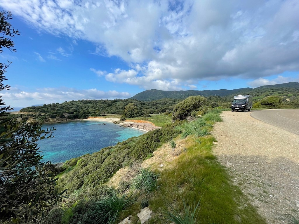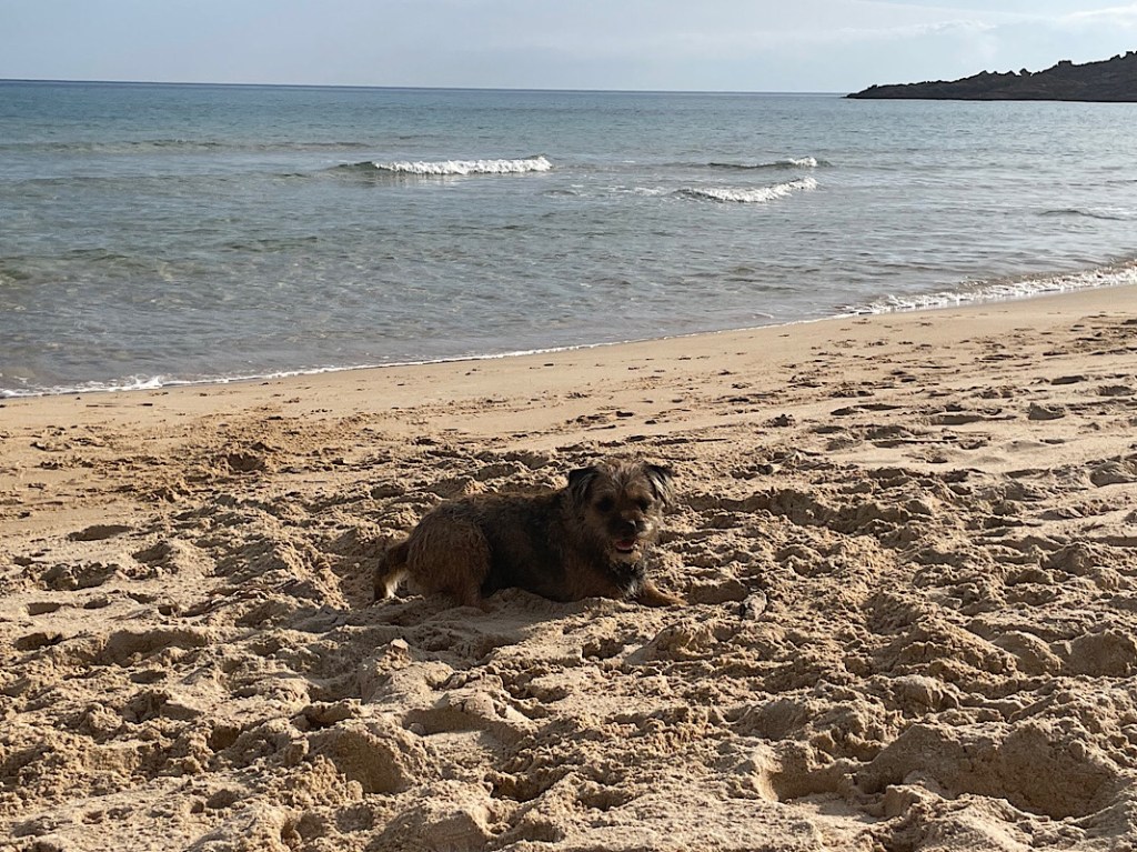We had planned to stay in Chia, having got over our mosquito fear of Stagno pools of inland water, of which Chia has two. I suspect it is seasonal, but we have not experienced many mosquitoes when we have been near these to date, except the first time we visited Porto Pino just along the coast to use the services when there were lots during the day, but then randomly we had none today?! Anyway, when we got to Chia, 2 of the 3 potential park-ups had closed since reports from November and the third was nothing special. We did get to stay and have a late lunch and an hour or so on the gorgeous powder sand, almost empty Chia beach watching the dogs enjoying themselves. Total chill 😎