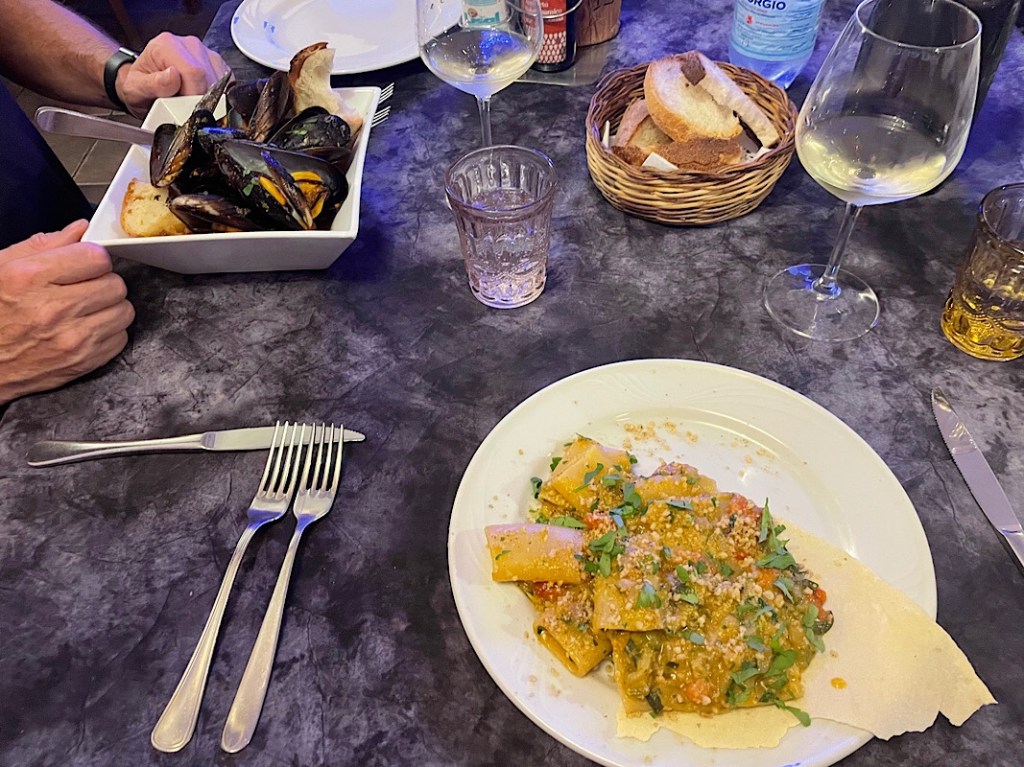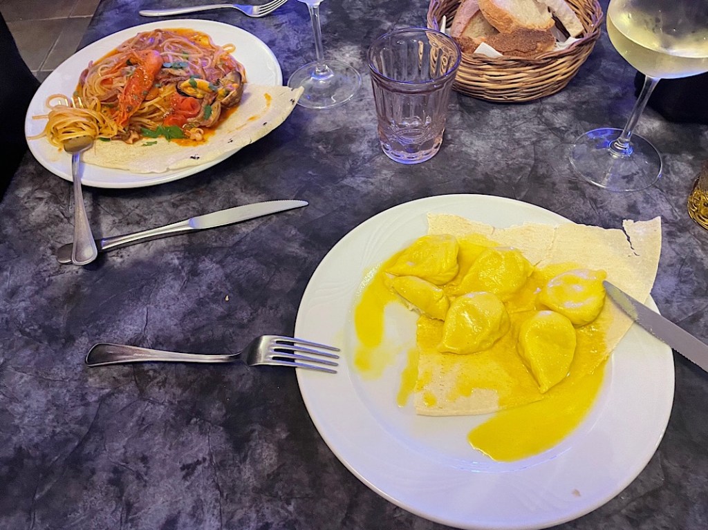 The rain started again not long after we got back but thankfully cleared in the evening so we could have a last night in Cagliari. We grabbed a beer whilst we decided which restaurant to go to. Thankfully we had narrowed it down to two options from previous trips so it was not the usual saga of indecision. We had contemplated visiting the restaurant of the “King of Tuna” Luigi Pomata from the Stanley Tucci Searching for Italy programme. However, we had inadvertently had tuna at lunch and it was not opening until later. So we ended up at Terra e Mari, where we got to finish our tick list of local specialities with some Culurgiones (potato filled pasta pasties) in saffron butter and Seadas (cheese and lemon filled ravioli in honey).