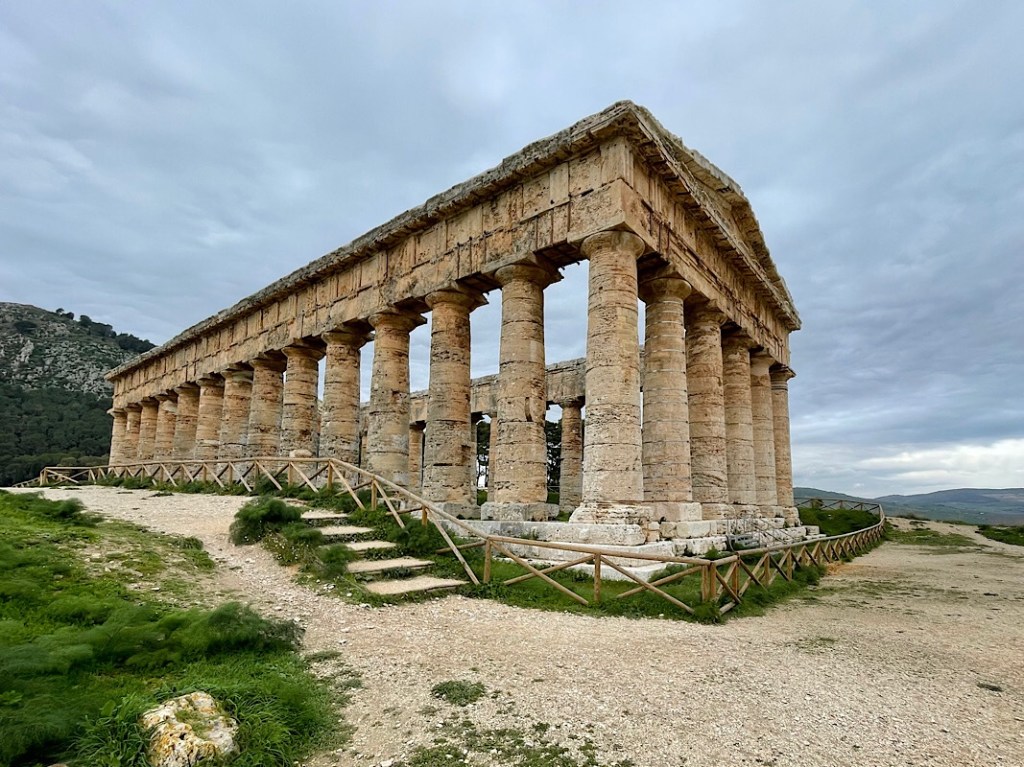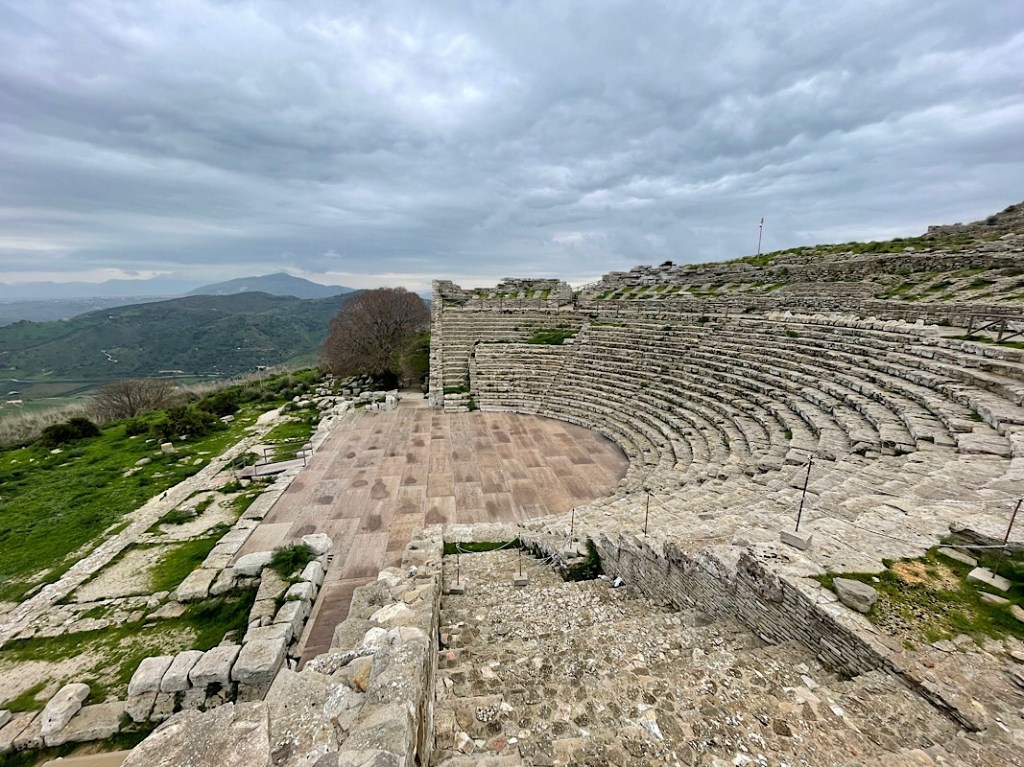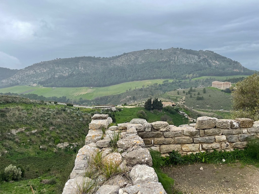 Today’s destination was Segesta, renowned for its temple but also containing the ruins of a Greek amphitheater, city walls, church, castle and the house of Navarch Heraclius, commander of the Segesta naval fleet. Additionally the site of the first confirmed Mosque on Sicily as another example of the multiple civilisations which have colonised these lands. The temple was built in 430 BC and although it has Hellenic influences, likely from employed Greek designers and workers it pre-dates the Greek era, being built by the Elimi people of Anatolian (Turkish) origin. The temple itself was never actually completed, it is hypothesised that there was never a roof due to the invasion by the Carthaginian’s which occurred during its construction. The temple is built on the top of a hill across a valley from what was the city of Segesta. Segesta and nearby Erice, where we are spending tonight, are believed to have been founded in 9th century BC by Trojan refugees becoming the Elimi people, although this is not backed by archeological evidence.