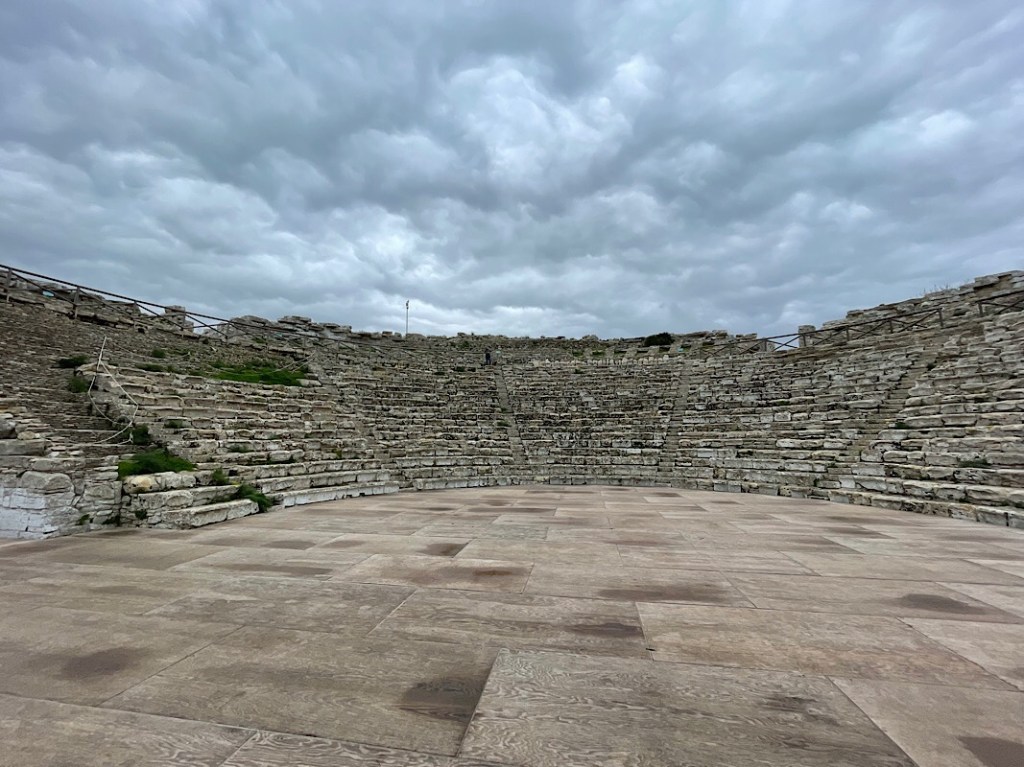 We then crested the hill to reach first what was apparently a gymnasium dedicated to the education of the city’s youth, based on inscriptions found on the floors. Although to be honest, the actual remains and lack of information boards in this area made that hard to discern. There was also a Bouleuterion, or assembly hall added during the Hellenic / Roman era for the governing of the city, believed to have originally held 200 people. A church and castle remains were also added in this area in the Medieval era (around 1442).