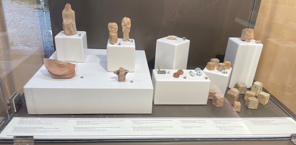 Finally we passed the Antiquarium containing some of the artefacts found on site. So often when we have visited ancient sites the artefacts have been sequestered away to some museum many miles away, it was really good to seem them on site, as it gave a much more human feel. Apparently many were found in a “dump” found at the base of the hill on one side. The pottery patterns etc look like new, mind boggling some of these are 2400+years old.