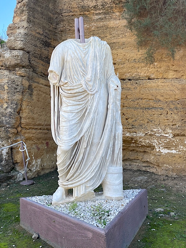 Another sight that will stay in my memory is the fabulous view from the ridge looking through the temples out to sea, the sun reflecting off the water. We just stood for quite a while looking out at the houses, farms and businesses living in the shadow of these great monuments. How that view has changed over the years. Finally, another favourite memory is the two marble statues which were only unearthed in 2005 on site. The folds in their robes and even a ring on the finger of one were just so detailed and lifelike, however the heads / feet are missing I was just really struck that they are finding such large objects this late of the site and shows how our appreciation and efforts to preserve and investigate these sites has not always been shared in the past.