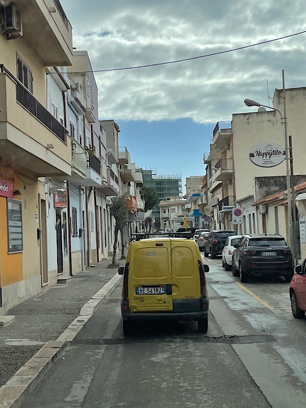The drive was not so very scenic, this stretch of Sicily clearly being the vegetable garden of Sicily, achieved by acres and acres of poly tunnels lining each side of the road. It is not quite as vast and desolate looking as the Almeria region of Spain, but proportionally it is up there. We drove through a few very busy little towns, dodging the double parked cars and those pulling out of side streets etc into the most minimal gaps in traffic. Little roadside vegetable stalls provided some colourful intervals to our journey, one was just a old Fiat Panda with the boot filled to the roof with oranges, suspension bowing under the weight.