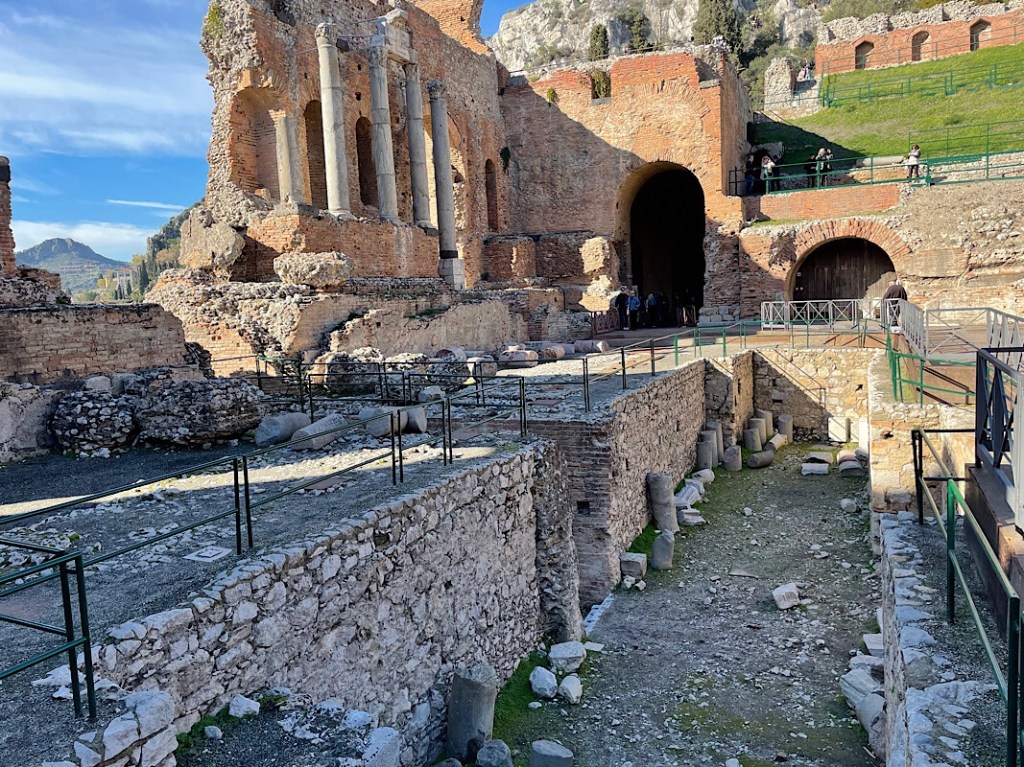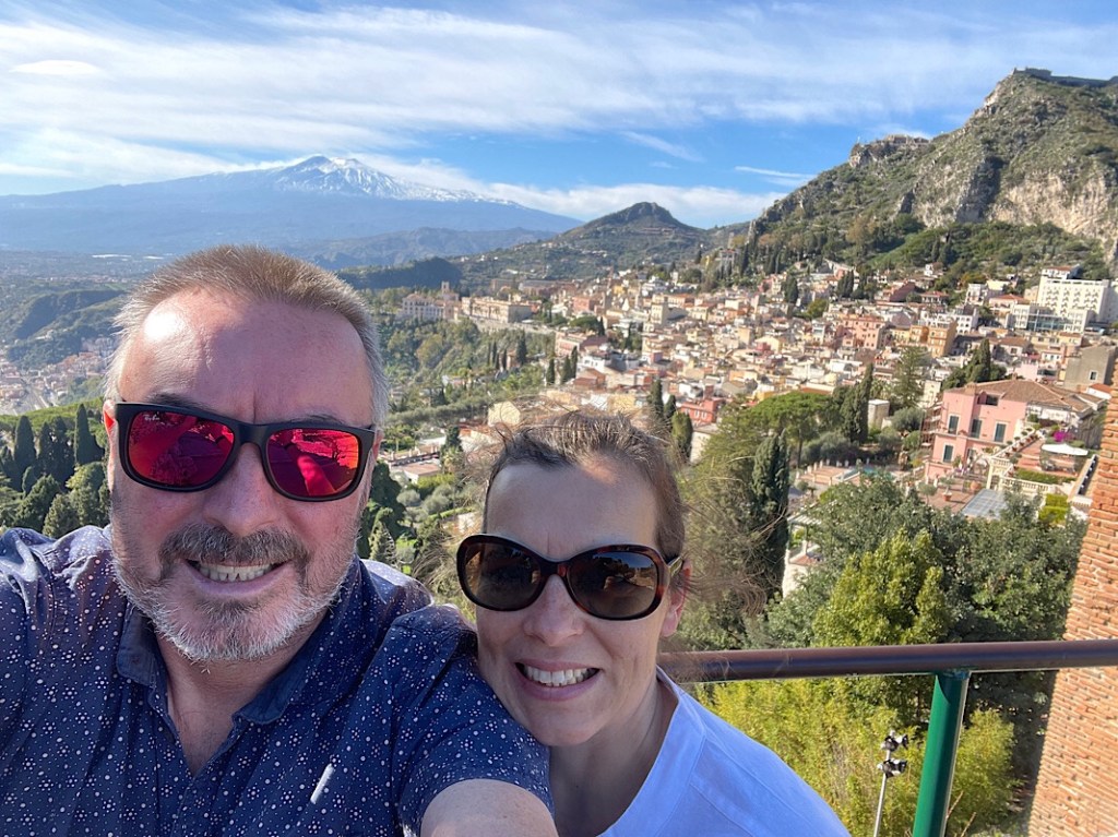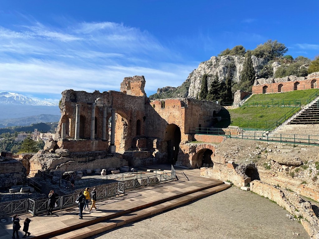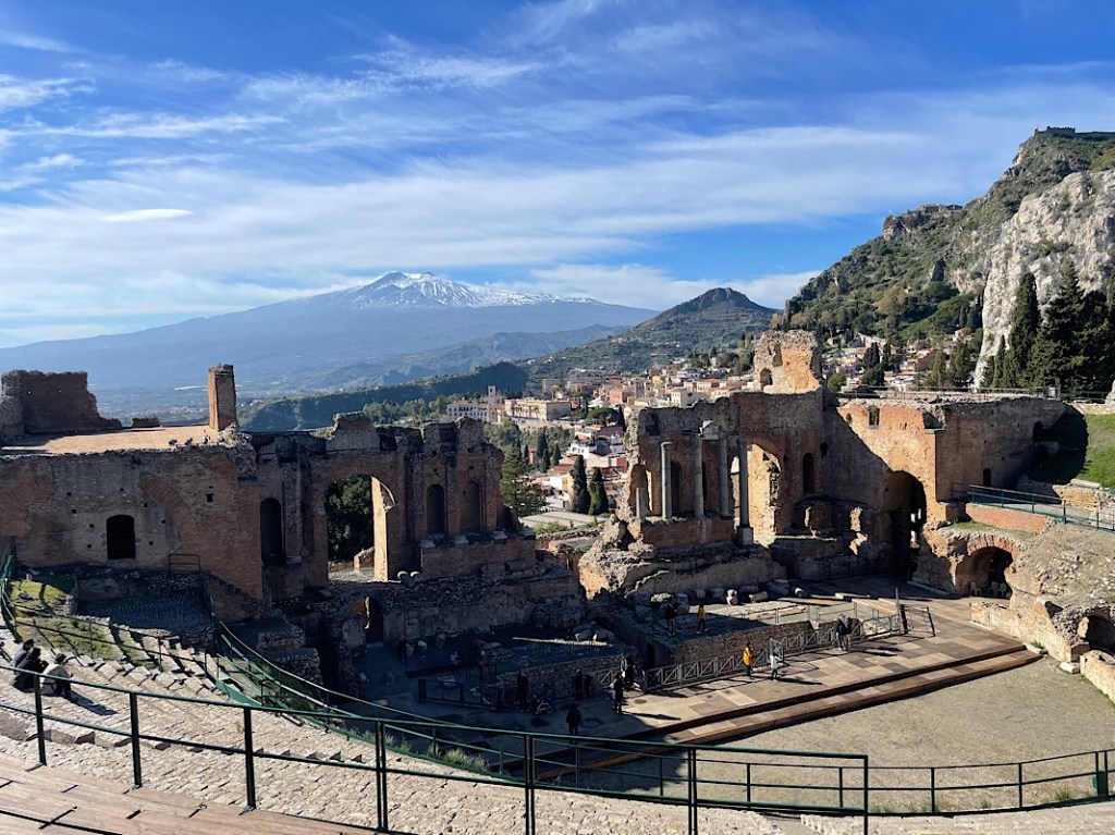 We walked round the site and got amazing views over Taormina and Etna and to the lovely Isola Bella below. We could even see along the coast to the “toe” on mainland Italy