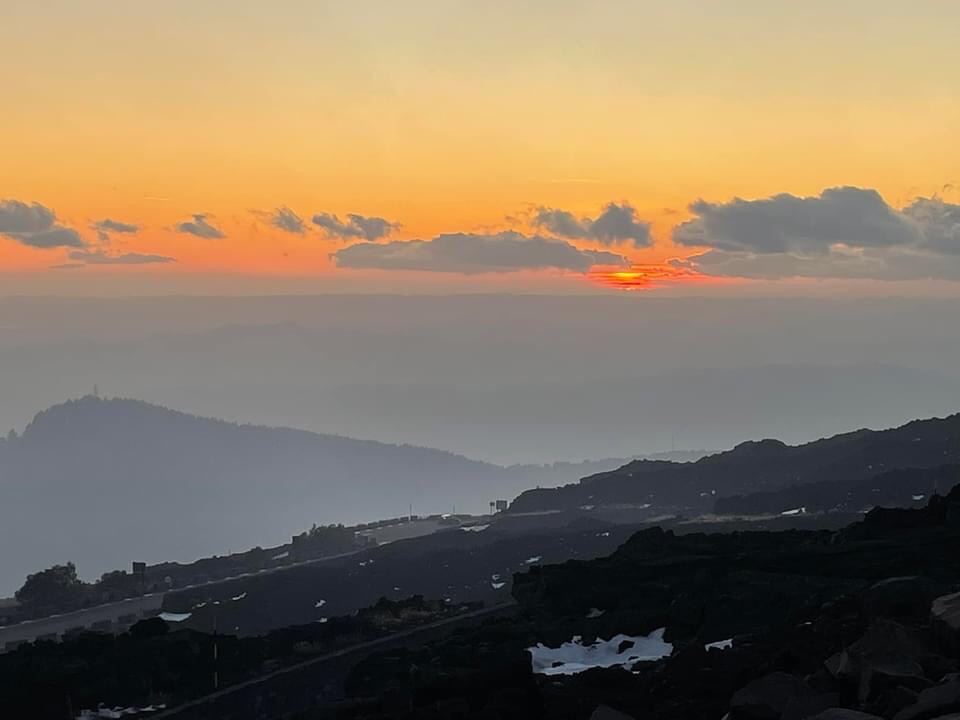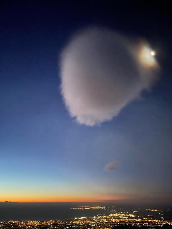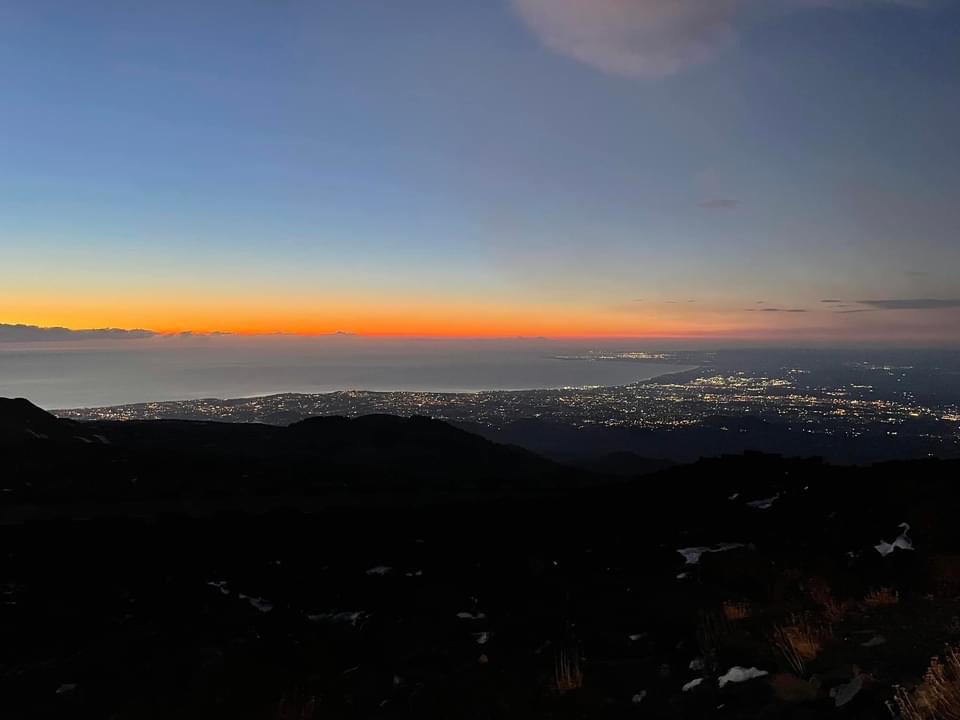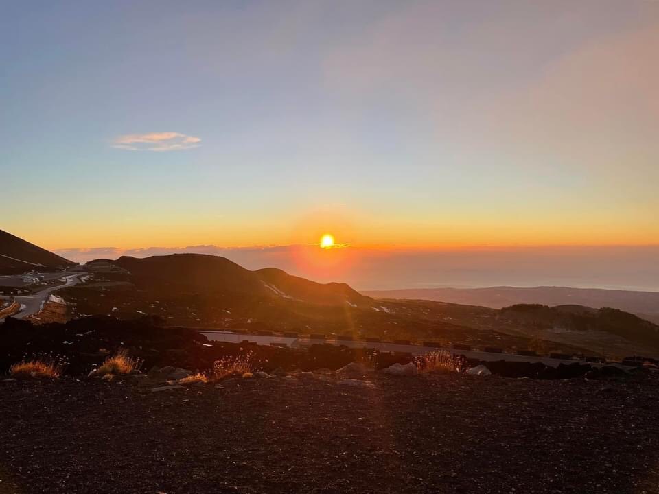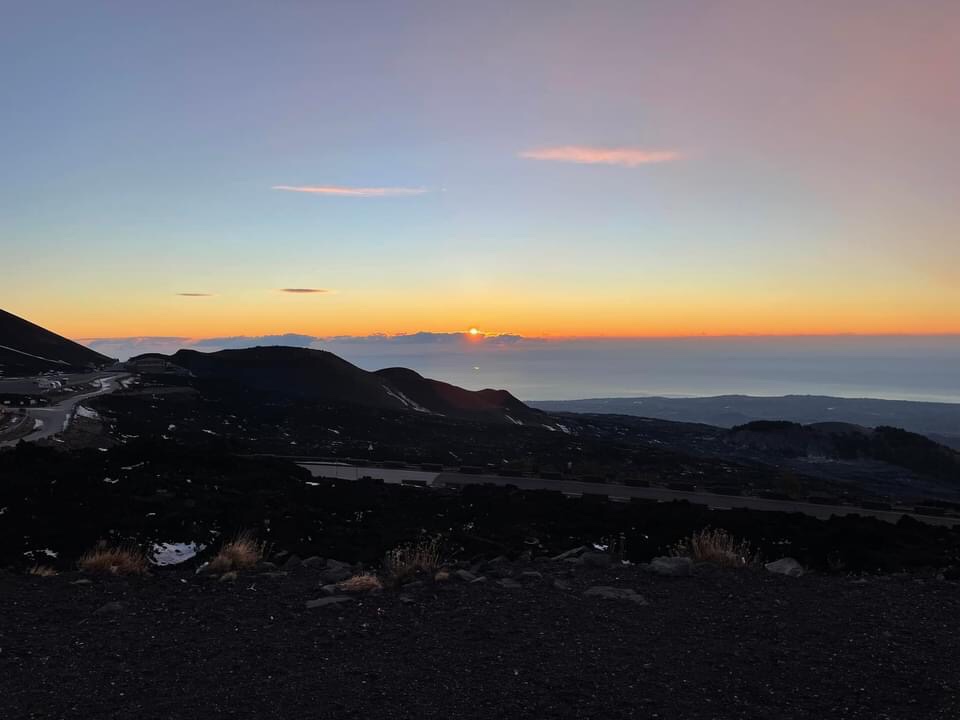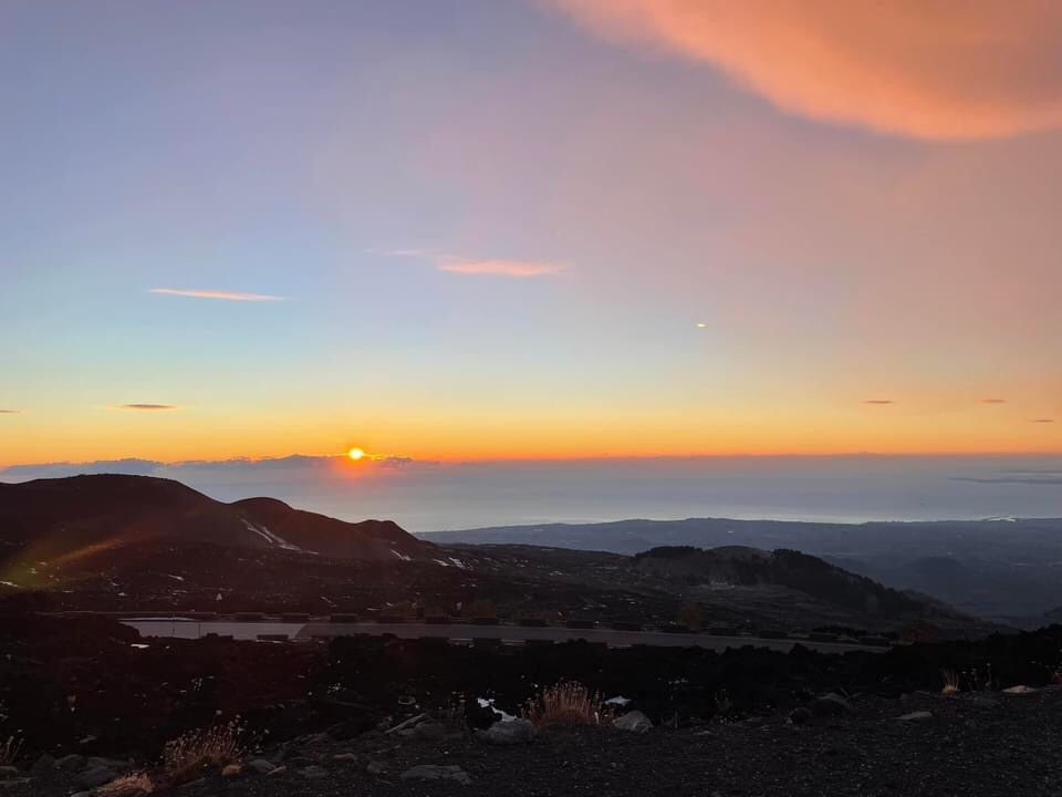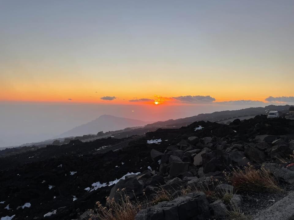 We were up before sunrise due to our disrupted sleep. We opened the blinds whilst drinking our first cup of tea to see both all the lights of Catania twinkling and simultaneously the first indigos and ambers of dawn arriving above. Utterly beautiful 😍 Kevin went out for photos and said there was a wierd spherical cloud just over us that seemed to be rolling on the same spot rather than being blown on the wind. We guess it might be some heating from the volcano phenomena.