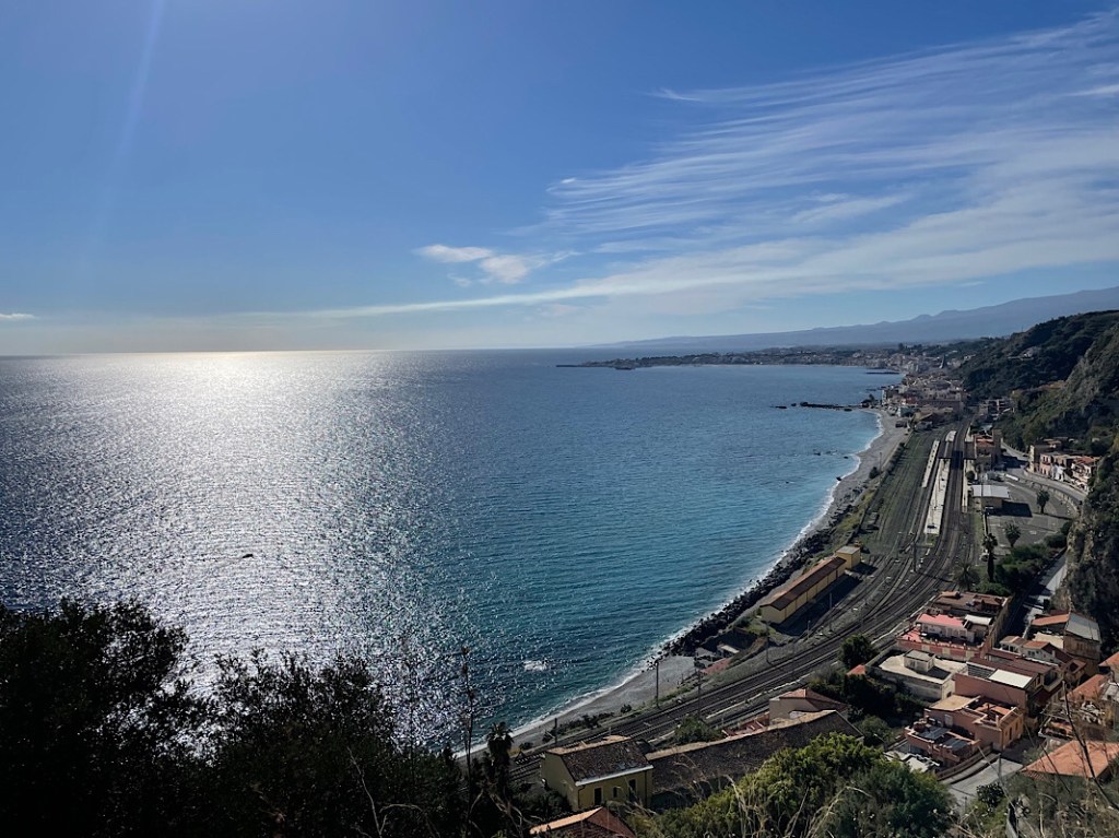 Anyway, we had a target for the day to get to Taormina for the ultimate view in Sicily, compromising ancient ruins and a volcano, an iconic shot. Standing on the Greek Amphitheatre looking out at Etna. According to Google maps it was an hour along the seafront to get there. We could see Taormina perched on the hilltop as soon as we reached the beachfront. Everyone was out though for a Sunday stroll down the beachfront and progress was steady. However, the weather was glorious, we were in shirt sleeves, standing out from the crowd, with the locals in puffer jackets.