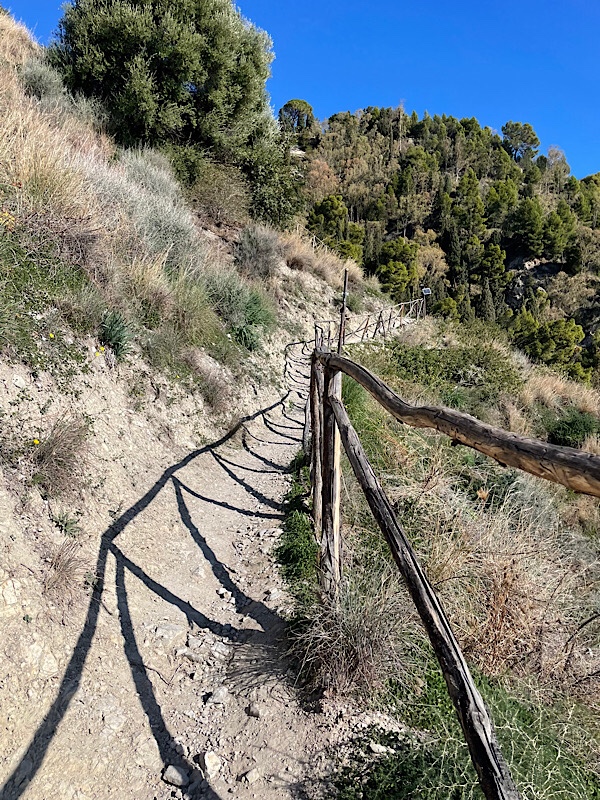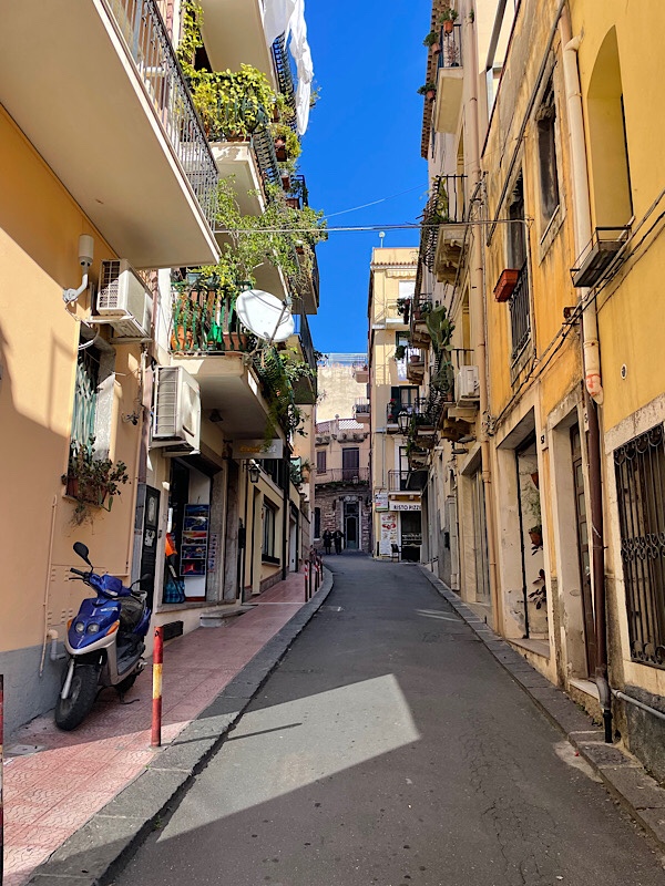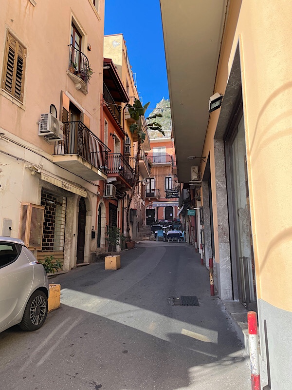 After a short walk along a main road with no pavements carrying the dogs we found the path up to Taormina. A near vertical ascent to 204m / 669ft up a very narrow and rather rickety pathway up the cliff side. We emerged eventually into the Taormina streets though it was past noon on a Sunday and most of the shops were closed. The narrow streets were certainly not suitable for motorhomes and we were happy to have walked.