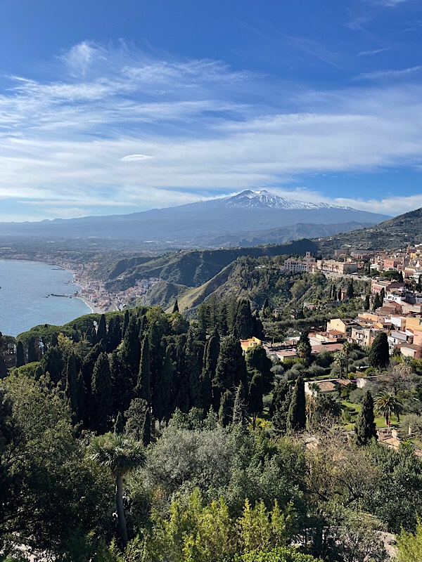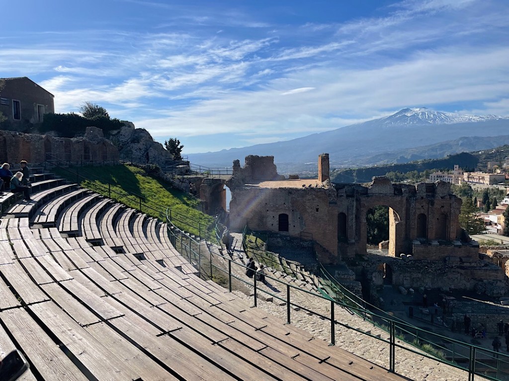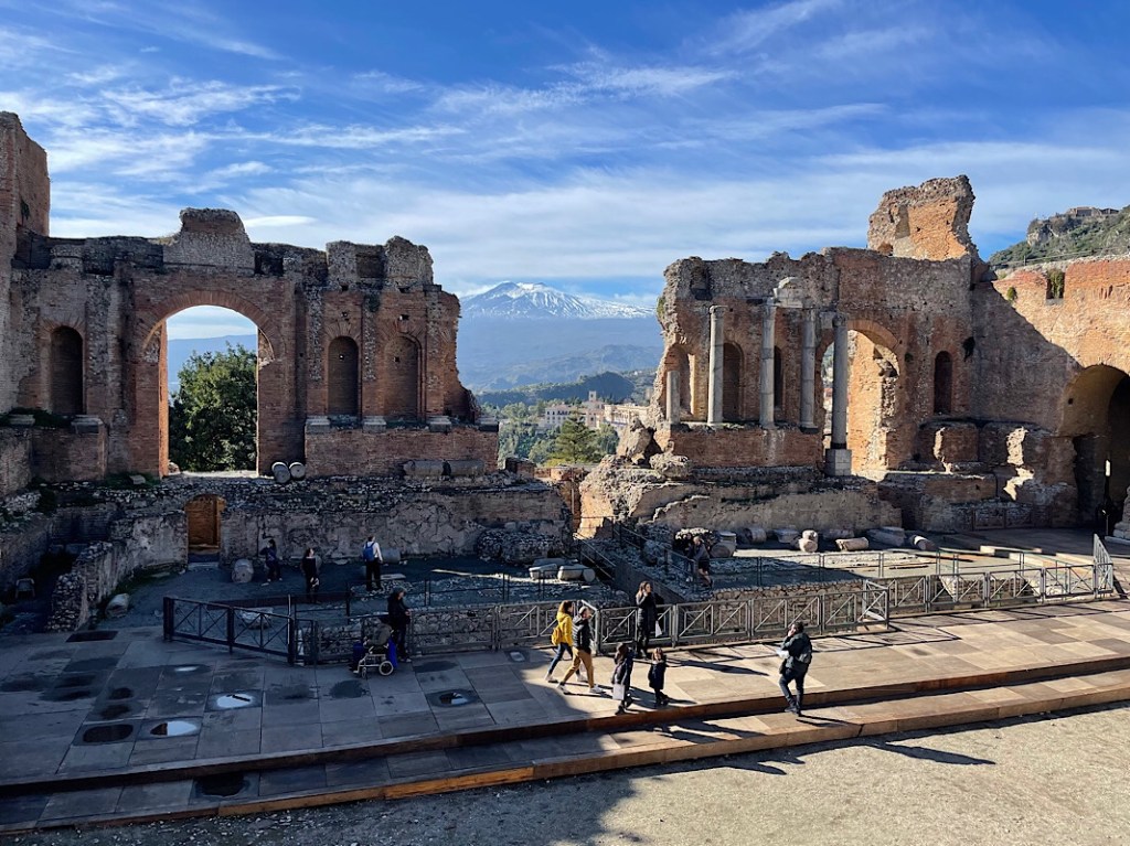 We climbed still higher to the top of the town where the tat shops lined both sides and were open, we were clearly on the right route to the Greek Amphitheatre. We paid our entrance and walk up yet more steps into the amphitheatre itself. It is ingeniously built into a cliff side to provide an absolutely stunning view over the town of Taormina to Mount Etna. This eastern side of Etna has even more snow and was glistening in the sunshine, as we were blessed with more clear skies to see the fantastic view.